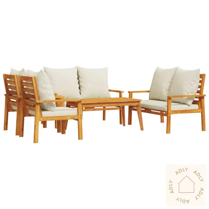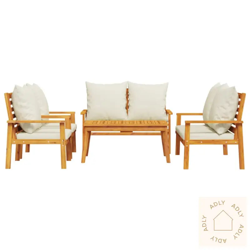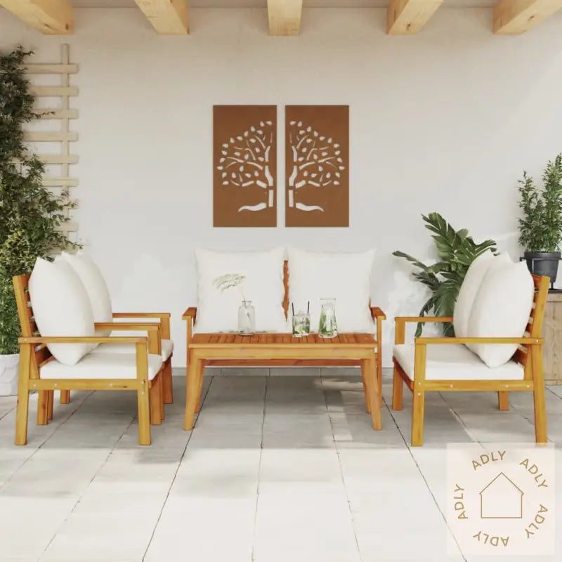 Hagesofagruppen er laget av slitesterkt, oljebehandlet heltre akasie, et bærekraftig valg som tåler både daglig bruk og varierende værforhold. Det naturlige treverket gir lang levetid og stabilitet, i tillegg til den eksklusive følelsen du får med ekte tre.Kombinasjonen av komfortable puter og godt utformede armlener og ryggstøtte sørger for en herlig sitteopplevelse, enten du inviterer venner på kaffe eller nyter rolige kvelder alene. De tykke seteputene og myke ryggputene i kremhvit polyester gir ekstra god støtte, og stoffet holder seg pent lenge. Bordplaten i heltre akasie gir deg en solid og stabil overflate som er ideell for servering av mat og drikke, spill eller dekorasjoner. Bordet rengjøres enkelt med en fuktig klut, noe som gjør vedlikeholdet problemfritt.Hagesettet er bredt anvendelig og passer like godt på verandaen, balkongen, bakgården, plenen eller midt i hagen. Uansett hvor du plasserer det, blir dette settet et naturlig samlingspunkt utendørs.Godt å vite: