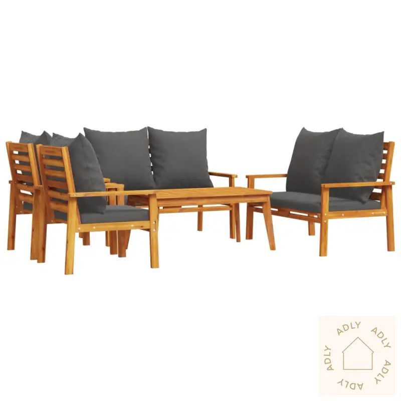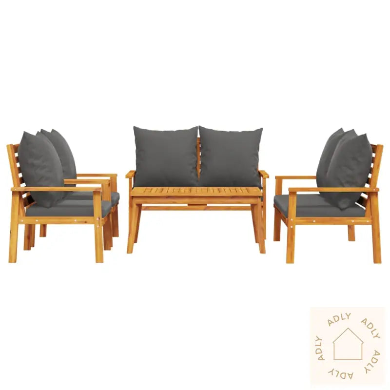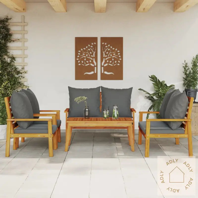 Heltre akasie: Møblene er laget av solid akasietre, som er kjent for sin styrke og holdbarhet. Heltre akasie har vakre naturlige årringer og en varm fargetone som gir hver del et unikt utseende. Det slitesterke oljebehandlede treverket tåler vær og vind, og gir deg utemøbler som varer lenge og krever lite vedlikehold.Komfortabel sitteopplevelse: Settet har både armlener og ryggstøtte for økt komfort når du vil slappe av ute. De tykke og myke putene gir ekstra støtte og skaper en behagelig sone for både små og store pauser. Putene har trekk i slitesterk polyester og fyll av hulfiber, som bidrar til både god støtte og lang levetid.Bord med praktisk bordplate: Bordplaten i heltre akasie er robust, stabil og ideell til servering eller dekorasjoner. Overflaten er enkel å rengjøre—det holder å tørke over med en fuktig klut. Den solide utførelsen gjør at bordet står stødig, også med flere personer rundt.Mange bruksområder: Dette komplette hage- og loungesettet er like egnet på veranda, terrasse, i bakgården eller ute på plenen. Det inviterer til mange hyggelige stunder sammen med venner og familie.Godt å vite: