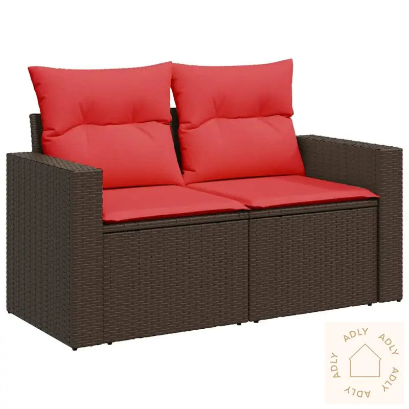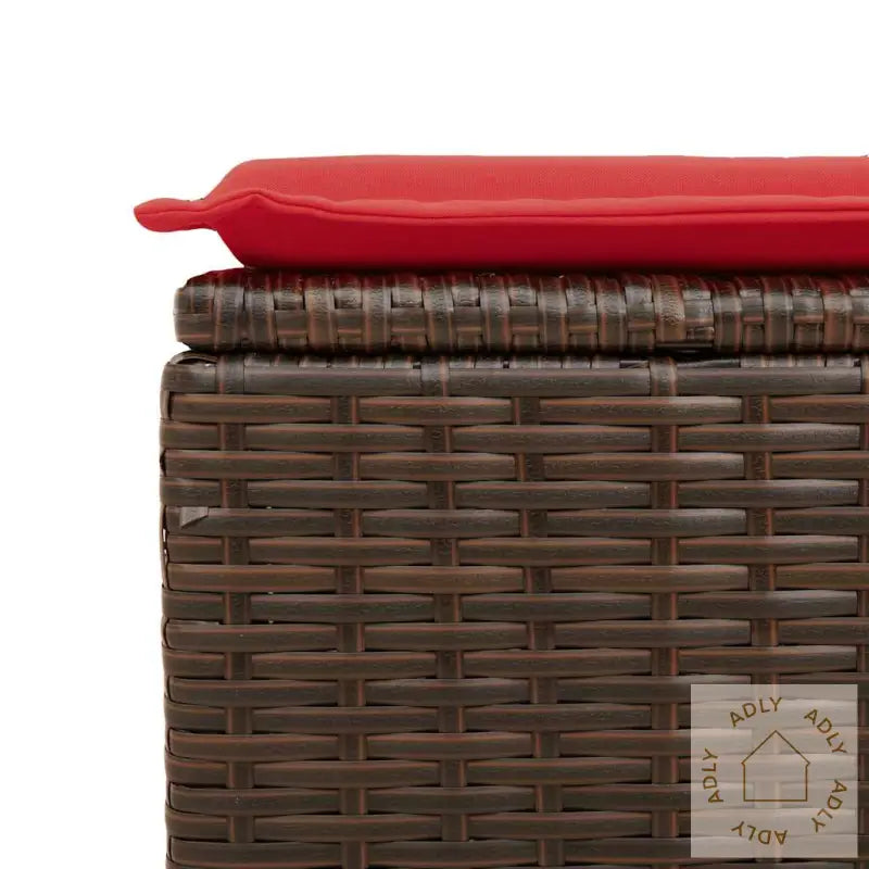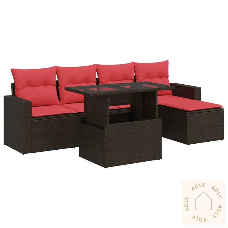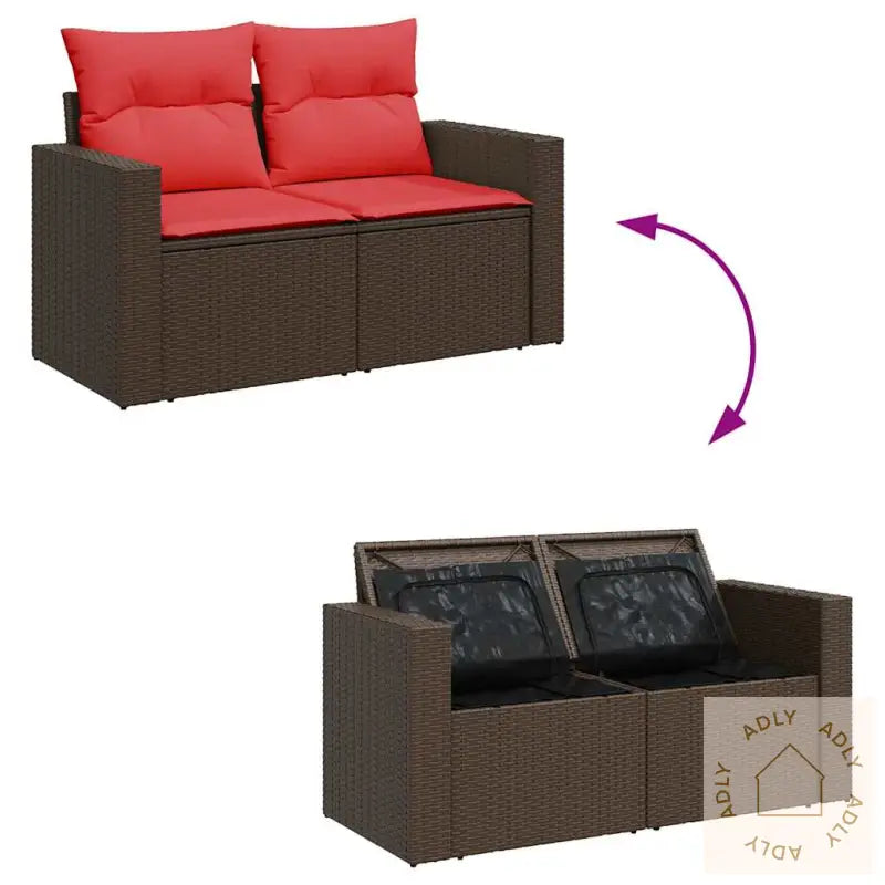 For å bevare utseendet på utemøblene dine anbefales det å beskytte dem med et vanntett trekk når de ikke er i bruk.Maksimal lastekapasitet (per sete): 110 kgUV-bestandig, så fargene holder seg fine selv etter mye solJusterbare føtter i plast sørger for stødighet på ulike underlagMontering kreves: jaMidtsete:Farge: brunMaterialer: PE-rotting, pulverlakkert stålMål: 55 x 62 x 69 cm (B x D x H)Mål sete: 55 x 55 cm (B x D)Høyde sete fra bakken (uten pute): 37 cmVanntett pose dimensjoner: 55 x 53 x 34 cm (L x B x H)Krakk:Farge: brunMaterialer: PE-rotting, pulverlakkert stålMål: 55 x 55 x 37 cm (B x D x H)Vanntett pose dimensjoner: 55 x 53 x 34 cm (L x B x H)Hjørnesete med rottingarmlener:Farge: brunMaterialer: PE-rotting, pulverlakkert stålMål: 65,5 x 62 x 69 cm (B x D x H)Mål sete: 55 x 55 cm (B x D)Høyde sete fra bakken (uten pute): 37 cmArmlenhøyde fra bakken: 55 cmBredde armlene: 10 cmBord:Farge: brunMaterialer: PE-rotting, pulverlakkert stål, herdet glassMål: 100 x 55 x 44/73 cm (L x B x H)Pute:Farge: rødMateriale trekk: stoff (100% polyester)Fyll setepute: skumFyllmateriale ryggpute: bomullsfiberMål setepute: 55 x 55 x 3 cm (B x D x T)Mål ryggpute: 55 x 45 x 13 cm (L x B x T)Leveransen inneholder:1 x hagebord2 x hjørnesete med rottingarmlener inkludert oppbevaring med vanntett bag2 x sentersete inkludert oppbevaringsfunksjon med vanntett bag1 x krakk med vanntett pose5 x seteputer med avtagbart og vaskbart trekk4 x ryggputer
