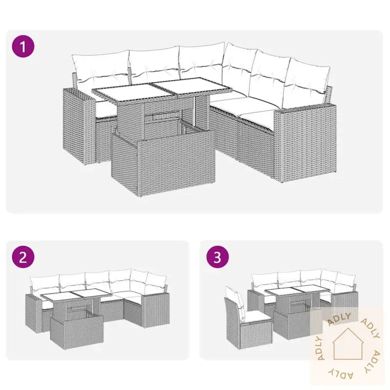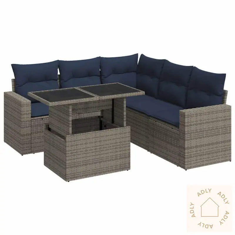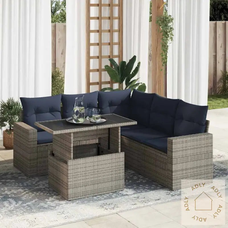 For å forlenge levetiden og bevare utseendet anbefaler vi å beskytte møblene med et vanntett trekk når de ikke er i bruk.Maksimal lastekapasitet per sete: 110 kgUV-bestandig for ekstra beskyttelse mot solblekingJusterbare føtter i plast gir stabilitet uavhengig av underlagMontering kreves: jaMidtsete:Farge: gråMaterialer: PE-rotting, pulverlakkert stålMål: 55 x 62 x 69 cm (B x D x H)Mål sete: 55 x 55 cm (B x D)Setehøyde fra bakken (uten pute): 37 cmVanntett bag dimensjoner: 55 x 53 x 34 cm (L x B x H)Hjørnesete:Farge: gråMaterialer: PE-rotting, pulverlakkert stålMål: 62 x 62 x 69 cm (B x D x H)Mål sete: 55 x 55 cm (B x D)Setehøyde fra bakken (uten pute): 37 cmVanntett bag dimensjoner: 55 x 53 x 34 cm (L x B x H)Hjørnesete med rottingarmlener:Farge: gråMaterialer: PE-rotting, pulverlakkert stålMål: 65,5 x 62 x 69 cm (B x D x H)Mål sete: 55 x 55 cm (B x D)Setehøyde fra bakken (uten pute): 37 cmArmlenhøyde: 55 cmBredde armlene: 10 cmBord:Farge: gråMaterialer: PE-rotting, pulverlakkert stål, herdet glassMål: 100 x 55 x 44/73 cm (L x B x H)Pute:Farge: marineblåTrekkmateriale: stoff (100% polyester)Fyll setepute: skum for god støtte og komfortFyll ryggpute: bomullsfiber for en myk følelseSetepute mål: 55 x 55 x 3 cm (B x D x T)Ryggpute mål: 55 x 45 x 13 cm (L x B x T)Leveransen inneholder:1 x hagebord1 x hjørnesete med oppbevaringsfunksjon og vanntett bag2 x hjørnesete med rottingarmlener og vanntett bag2 x sentersete med oppbevaringsfunksjon og vanntett bag5 x seteputer (avtakbart og vaskbart trekk)6 x ryggputer