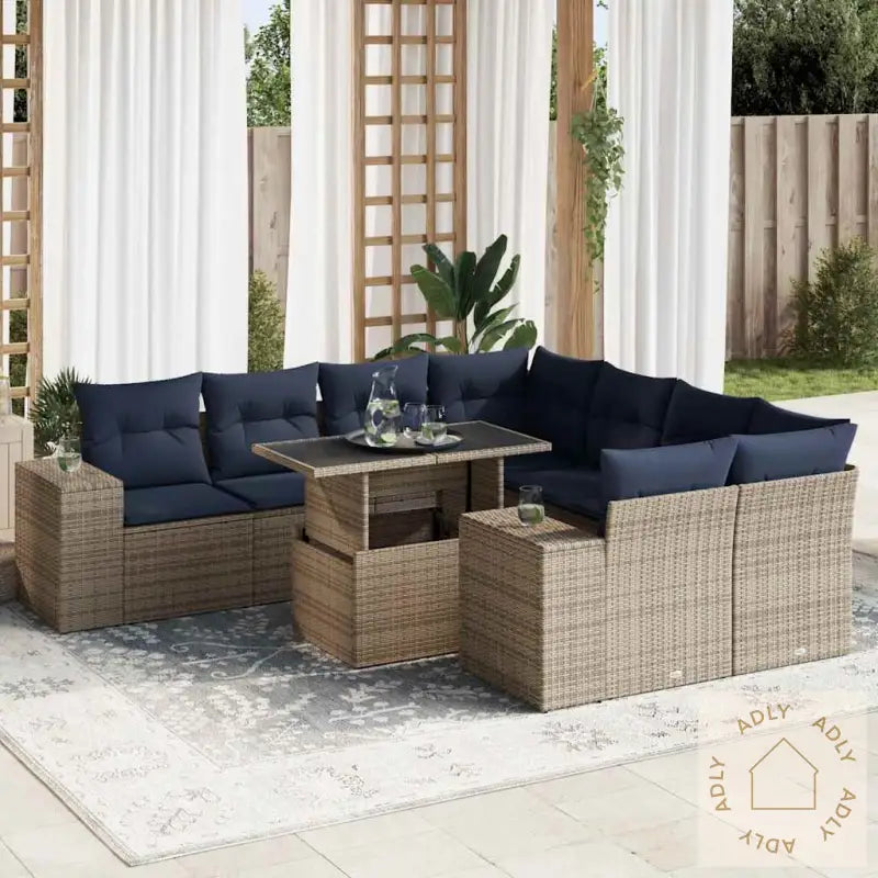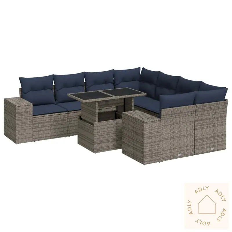 For at dine utemøbler alltid skal se flotte ut, anbefaler vi å bruke vanntette trekk når de ikke er i bruk.Maksimal lastekapasitet (per sete): 110 kgUV-bestandig slik at fargen holder seg fin året rundtJusterbare føtter i plast gir stabilitet på ujevnt underlagMontering kreves: jaHjørnesete:Farge: gråMaterialer: grå PE-rotting og pulverlakkert stålMål: 62 x 62 x 69 cm (B x D x H)Mål sete: 55 x 55 cm (B x D)Setehøyde fra bakken (uten pute): 37 cmMidtsete:Farge: gråMaterialer: grå PE-rotting og pulverlakkert stålMål: 55 x 62 x 69 cm (B x D x H)Mål sete: 55 x 55 cm (B x D)Setehøyde fra bakken (uten pute): 37 cmHjørnesete med rottingarmlener:Farge: gråMaterialer: grå PE-rotting og pulverlakkert stålMål: 93 x 62 x 69 cm (B x D x H)Mål sete: 55 x 55 cm (B x D)Setehøyde fra bakken (uten pute): 37 cmArmlenhøyde fra bakken: 55 cmBredde armlene: 27,5 cmBord:Farge: gråMaterialer: PE-rotting, pulverlakkert stål, herdet glassMål: 100 x 55 x 44/73 cm (L x B x H)Pute:Farge: marineblåMateriale trekk: tekstil (100% polyester)Fyll setepute: skumFyll ryggpute: bomullsfiberMål setepute: 55 x 55 x 3 cm (B x D x T)Mål ryggpute: 55 x 45 x 13 cm (L x B x T)Leveransen inneholder:1 x hagebord2 x hjørnesete med oppbevaringsfunksjon og vanntett bag2 x hjørnesete med rottingarmlener og oppbevaringsfunksjon med vanntett bag4 x sentersete med oppbevaringsfunksjon og vanntett bag8 x seteputer med avtagbart og vaskbart trekk10 x ryggputer