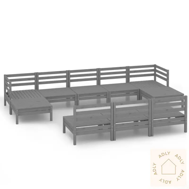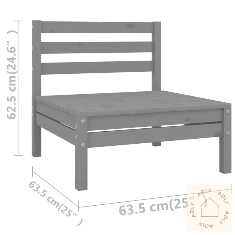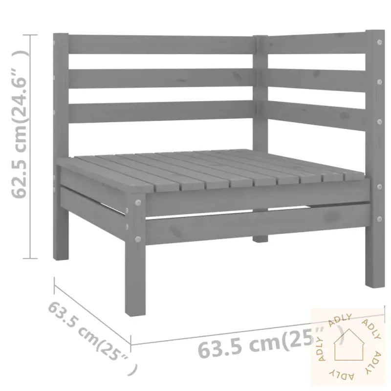 Farge: gråMateriale: heltre furuMål hjørne/mellomsofa: 63,5 x 63,5 x 62,5 cm (L x B x H)Mål bord/fotskammel: 63,5 x 63,5 x 28,5 cm (L x B x H)Montering kreves: jaLeveransen inneholder:2 x hjørnesofaer6 x midtsofaer2 x bord/fotskammel