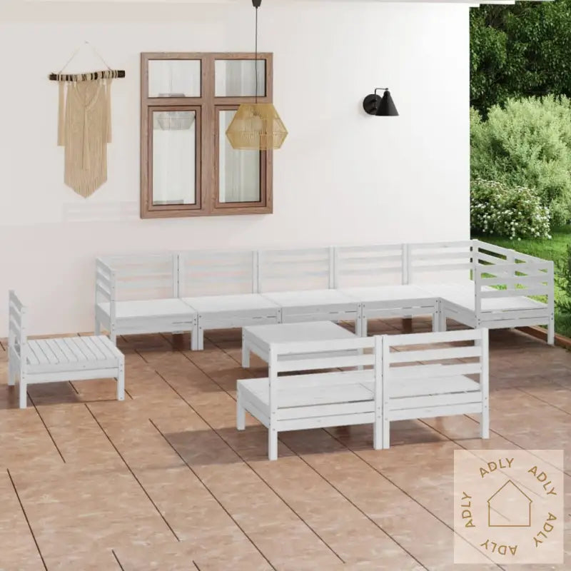 Farge: HvitMateriale: Heltre furuMål hjørne/mellomsofa: 63,5 x 63,5 x 62,5 cm (L x B x H)Mål bord/fotskammel: 63,5 x 63,5 x 28,5 cm (L x B x H)Montering kreves: JaLeveransen inneholder:3 x hjørnesofaer6 x midtsofaer2 x fotskamler/bord
