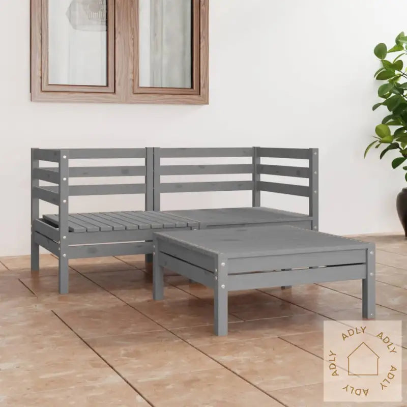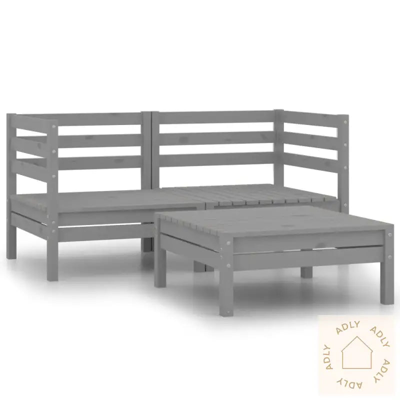 Farge: gråMateriale: heltre furuMål: 63,5 x 63,5 x 62,5 cm (B x D x H)Mål bord: 63,5 x 63,5 x 28,5 cm (L x B x H)Montering kreves: jaMaksimal lastekapasitet (per sete): 110 kgLeveransen inneholder:2 x hjørnesofaer1 x bord