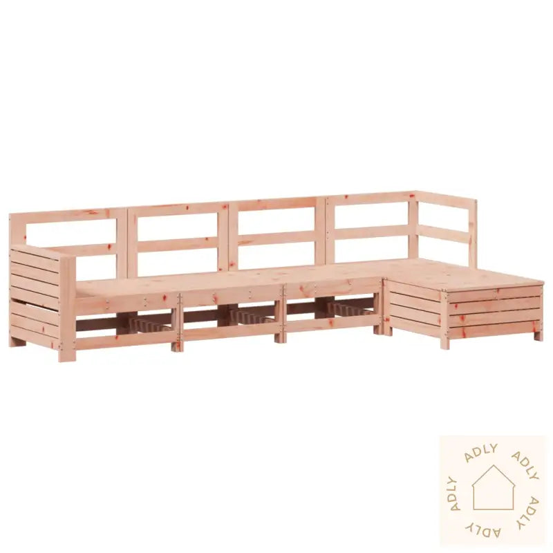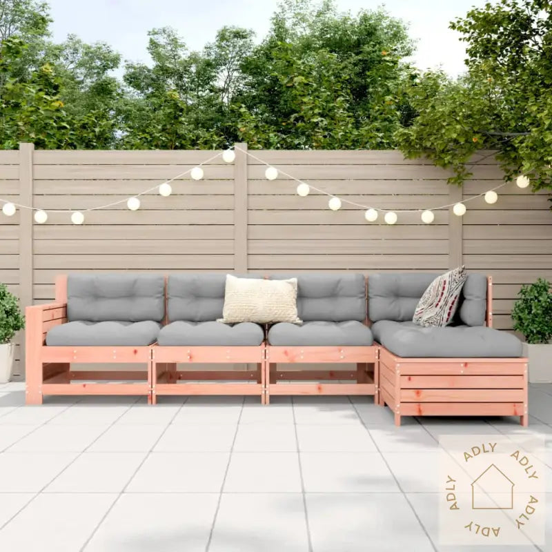 Robust og slitesterkt materiale: Hagemøblene er laget av heltre douglasgran, som er kjent for sin solide konstruksjon, lange levetid og den karakteristiske varme rødbrune fargen som sørger for en naturlig og innbydende atmosfære ute. Douglasgran har sterke kornmønstre og tåler både vær og vind, noe som gjør det til et ideelt valg for utemøbler du kan ha glede av i årevis.Godt ventilert og oppsamlingsforebyggende: Med sitt lamelldesign slipper møblene optimalt med luft gjennom, noe som ikke bare sørger for et komfortabelt sete, men også bidrar til å forebygge vannansamling etter regnvær. Du får alltid et tørt sted å sitte til uansett værforhold.Allsidig bruk: Fotskammelen fungerer både som ekstra sitteplass, støtte for beina eller til og med et salongbord der du kan sette fra deg drikke, snacks eller små dekorasjoner. Dette gir deg full fleksibilitet når du bruker uteplassen, og du får mest mulig ut av hvert eneste møbel.Praktisk sidebord: Sofaen har et smart sammenleggbart sidebord med gassfjær på armlenene, så du får et praktisk område for å oppbevare det du trenger rett ved din side – perfekt for mobiltelefon, bok eller kaffekopp!Modulært design: Settet har et moderne, modulært design som lar deg flytte rundt på delene akkurat slik du vil. På den måten kan du endre oppsett og størrelse på gruppen ut fra besøket eller anledningen. Skap enkelt den perfekte utesonen tilpasset dine behov og preferanser.Godt å vite: