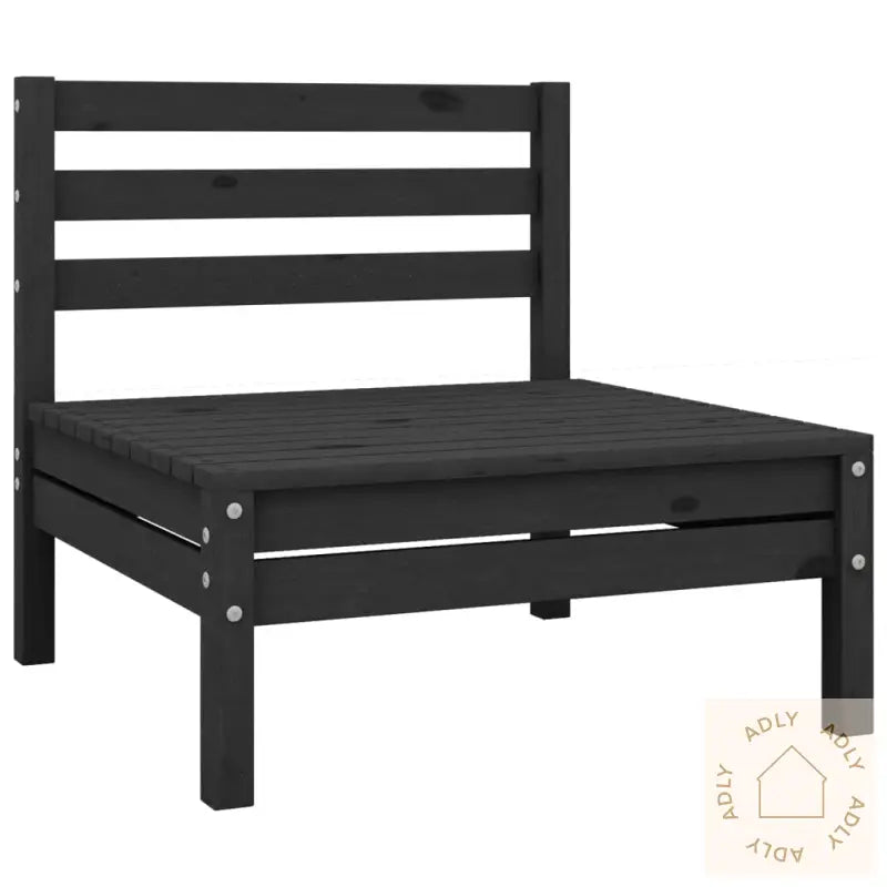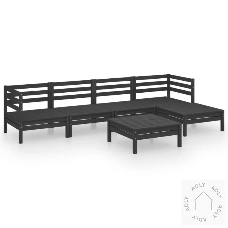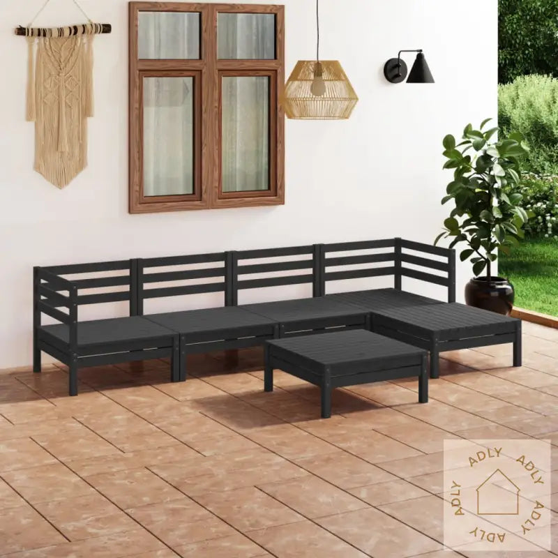 Farge: svartMateriale: heltre furuMål hjørne/mellomsofa: 63,5 x 63,5 x 62,5 cm (L x B x H)Mål bord/fotskammel: 63,5 x 63,5 x 28,5 cm (L x B x H)Montering kreves: jaLeveransen inneholder:2 x hjørnesofaer2 x midtsofaer2 x fotskammel/bord