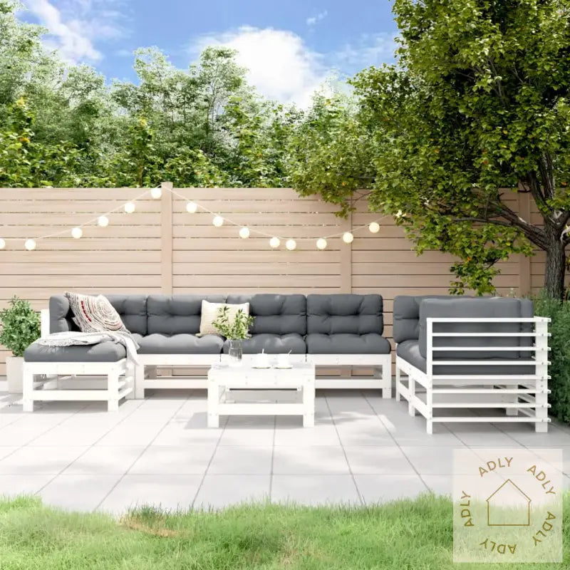 Puter følger ikke med, så du kan selv velge farger og stiler som passer deg.For å bevare hagemøblene best mulig gjennom hele sesongen, anbefaler vi å bruke et vanntett trekk når de ikke er i bruk.Farge: HvitMateriale: Heltre furuMateriale lameller: KryssfinerMål hjørnesofa: 63,5 x 63,5 x 60 cm (L x B x H)Mål midtsofa: 57,5 x 63,5 x 60 cm (L x B x H)Mål hagefotskammel/salongbord: 57,5 x 57,5 x 30 cm (L x B x H)Maksimal belastning per sete: 110 kgMontering krevesLeveransen inneholder:3 x hjørnesofaer3 x midtsofaer2 x hagefotskammel/sofabord