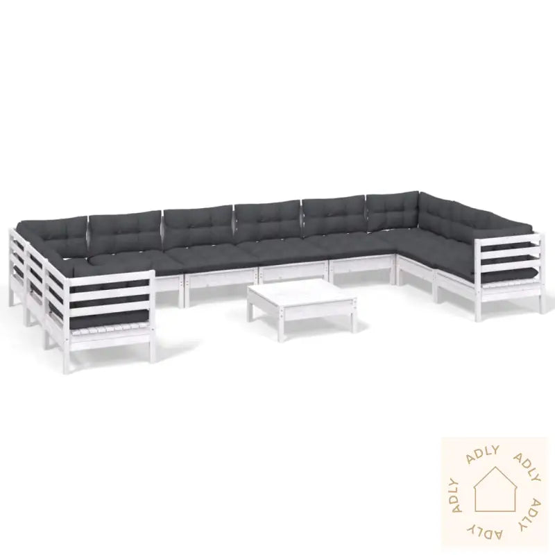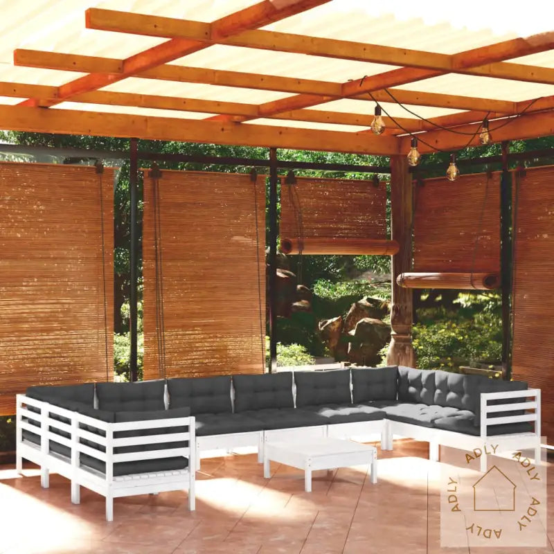 Farge: hvitFarge pute: antrasittMaterialer: heltre furu, stoff (100% polyester)Mål hjørne/mellomsofa: 63,5 x 63,5 x 62,5 cm (B x D x H)Mål bord/fotskammel: 63,5 x 63,5 x 28,5 cm (B x D x H)Mål setepute: 60 x 60 x 5 cm (L x B x T)Mål rygg-/sidepute: 60 x 32 x 5 cm (L x B x T)Maksimal lastekapasitet (per sete): 110 kgMontering kreves: jaLeveransen inneholder:4 x hjørnesofaer6 x midtsofaer2 x fotskamler/bord11 x seteputer14 x rygg-/sideputer
