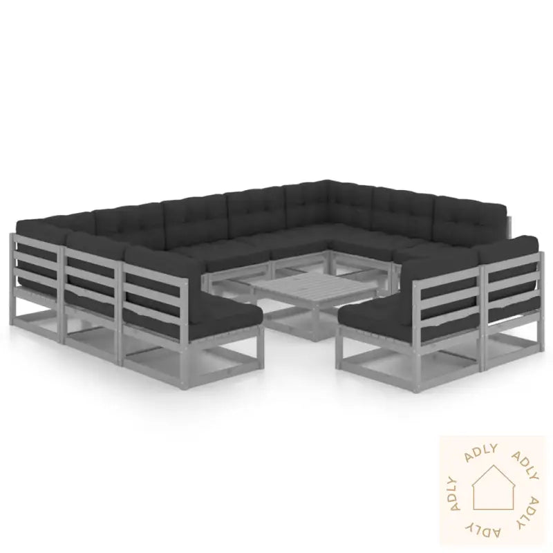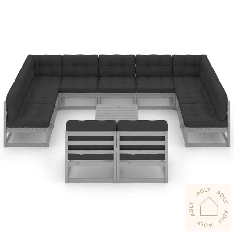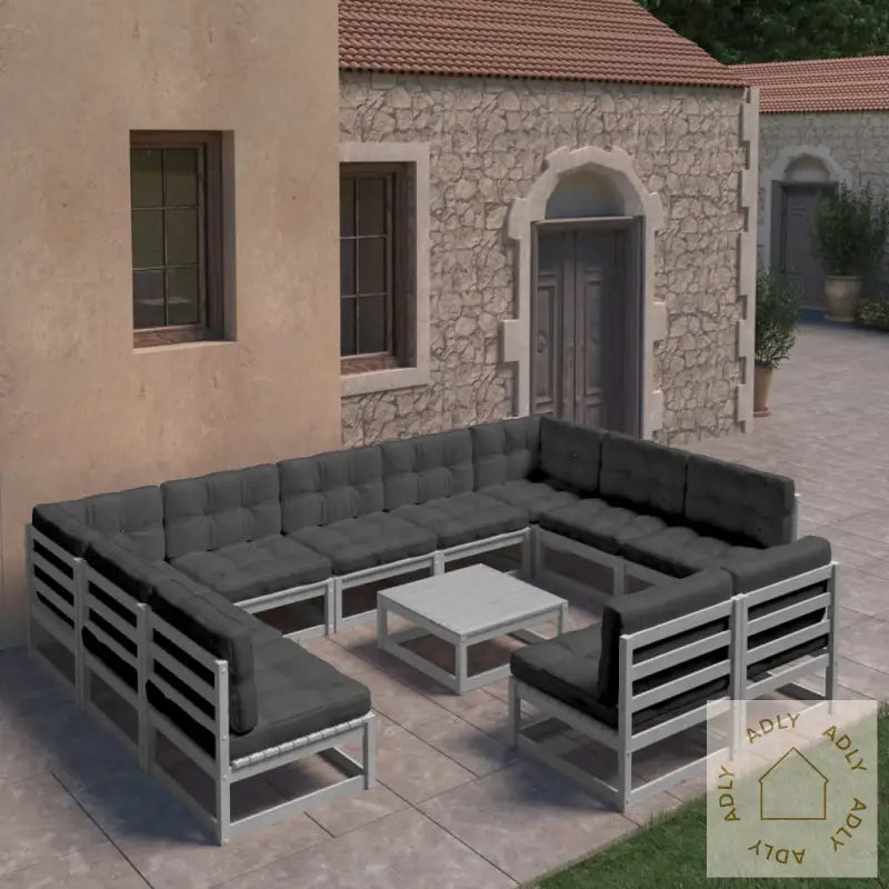 Farge sofa: gråFarge pute: antrasittMaterialer: heltre furu, stoff (100% polyester)Mål hjørnesofa: 70 x 70 x 67 cm (B x D x H)Mål midtsofa: 70 x 70 x 67 cm (B x D x H)Mål bord: 70 x 70 x 30 cm (B x D x H)Mål setepute: 70 x 70 x 8 cm (L x B x T)Mål ryggpute: 70 x 40 x 8 cm (L x B x T)Maksimal lastekapasitet (per sete): 110 kgMontering kreves: jaLeveransen inneholder:2 x hjørnesofaer9 x midtsofaer1 x bord11 x seteputer13 x ryggputer