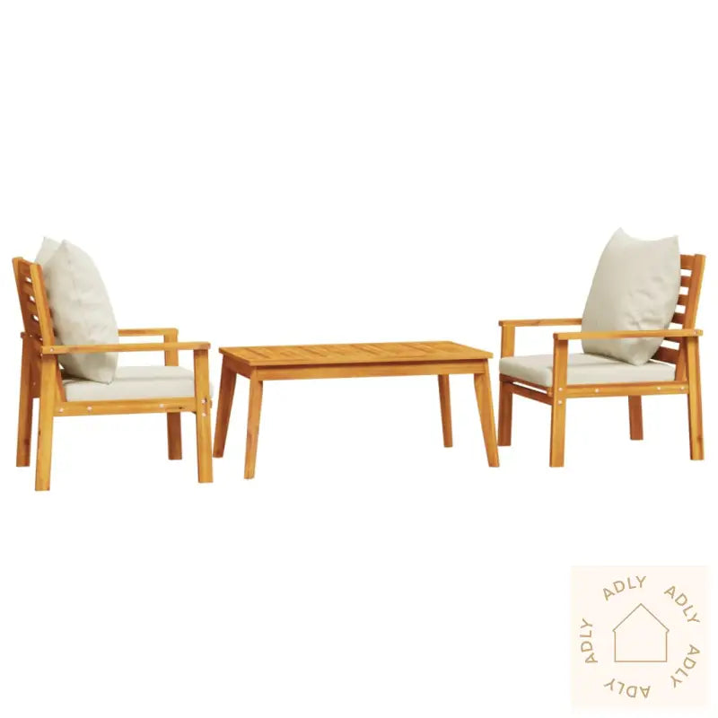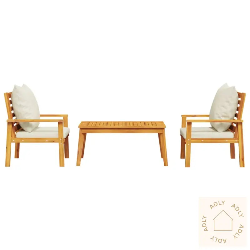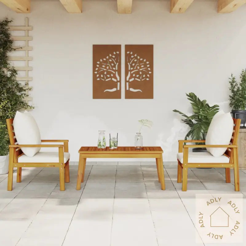 Heltre akasie: Denne hagesofagruppen er laget av oljebehandlet heltre akasie, noe som gir møblene både økt holdbarhet og stabilitet. Akasietre er et slitesterkt naturmateriale med en varm tone og vakre, naturlige treårer som gjør hvert sett unikt. Med sine solide materialer tåler møblene vær og vind godt, samtidig som de beholder sitt eksklusive utseende.Komfortabel sitteopplevelse: Stolene er utstyrt med armlener og ryggstøtte for maksimal komfort gjennom hele dagen. De tykke, myke putene i kremhvit polyester gir ekstra støtte og gjør det komfortabelt å sitte lenge – perfekt for sosiale sammenkomster eller en rolig kaffepause ute.Stabil bordplate som er lett å rengjøre: Bordet har en robust bordplate av heltre akasie. Den er både solid og enkel å vedlikeholde – tørk bare over med en fuktig klut hvis det skulle søles noe. Takket være materialet vil du få et slitesterkt hagebord som holder seg pent lenge.Bredt bruksområde: Dette hagesettet i heltre akasie mål passer til både små og store uteplasser, enten du har terrasse, balkong, bakgård, plen eller hage. Settets allsidighet gjør det lett å integrere i ulike uterom, slik at du får et koselig sted å slappe av uansett hvor du er.Godt å vite: