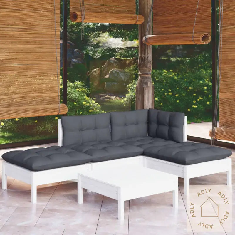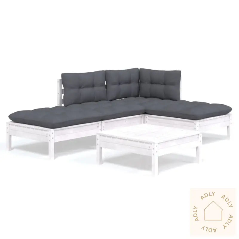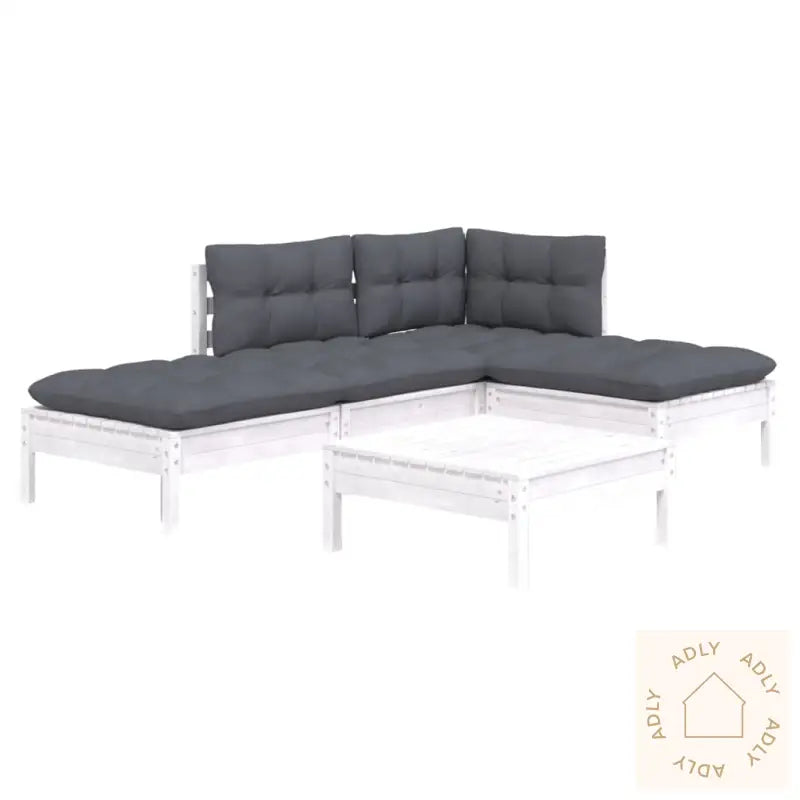 Farge: hvitFarge pute: antrasittMaterialer: heltre furu, stoff (100% polyester)Mål hjørne/mellomsofa: 63,5 x 63,5 x 62,5 cm (B x D x H)Mål bord/fotskammel: 63,5 x 63,5 x 28,5 cm (B x D x H)Mål setepute: 60 x 60 x 5 cm (L x B x T)Mål rygg-/sidepute: 60 x 32 x 5 cm (L x B x T)Montering kreves: jaMaksimal lastekapasitet (per sete): 110 kgLeveransen inneholder:1 x hjørnesofa1 x midtsofa3 x fotskamler/bord5 x seteputer3 x rygg-/sideputer