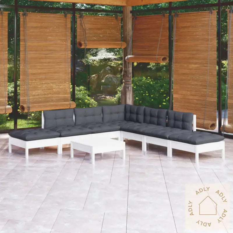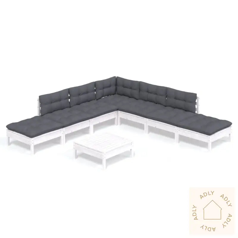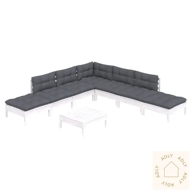 Farge: hvitFarge pute: antrasittMaterialer: heltre furu, stoff (100% polyester)Mål hjørne/mellomsofa: 63,5 x 63,5 x 62,5 cm (B x D x H)Mål bord/fotskammel: 63,5 x 63,5 x 28,5 cm (B x D x H)Mål setepute: 60 x 60 x 5 cm (L x B x T)Mål rygg-/sidepute: 60 x 32 x 5 cm (L x B x T)Montering kreves: jaMaksimal lastekapasitet (per sete): 110 kgLeveransen inneholder:1 x hjørnesofa4 x midtsofaer3 x fotskamler/bord8 x seteputer6 x rygg-/sideputer