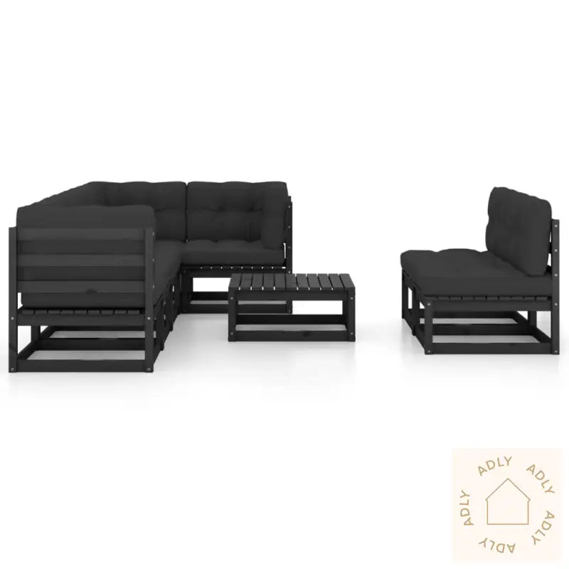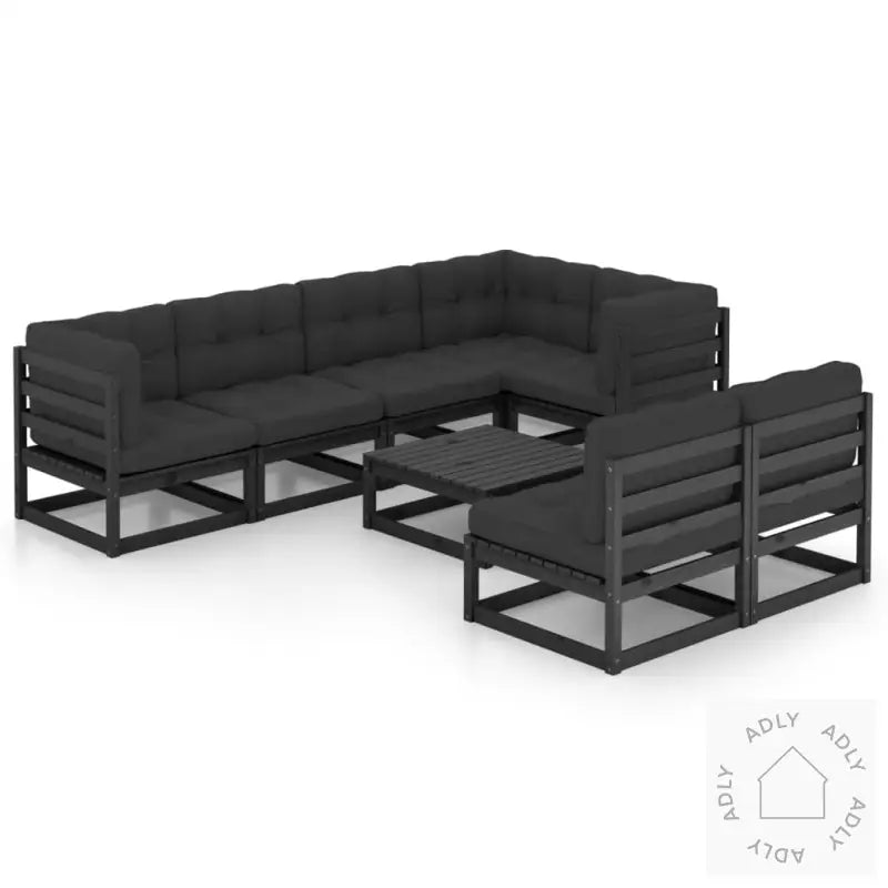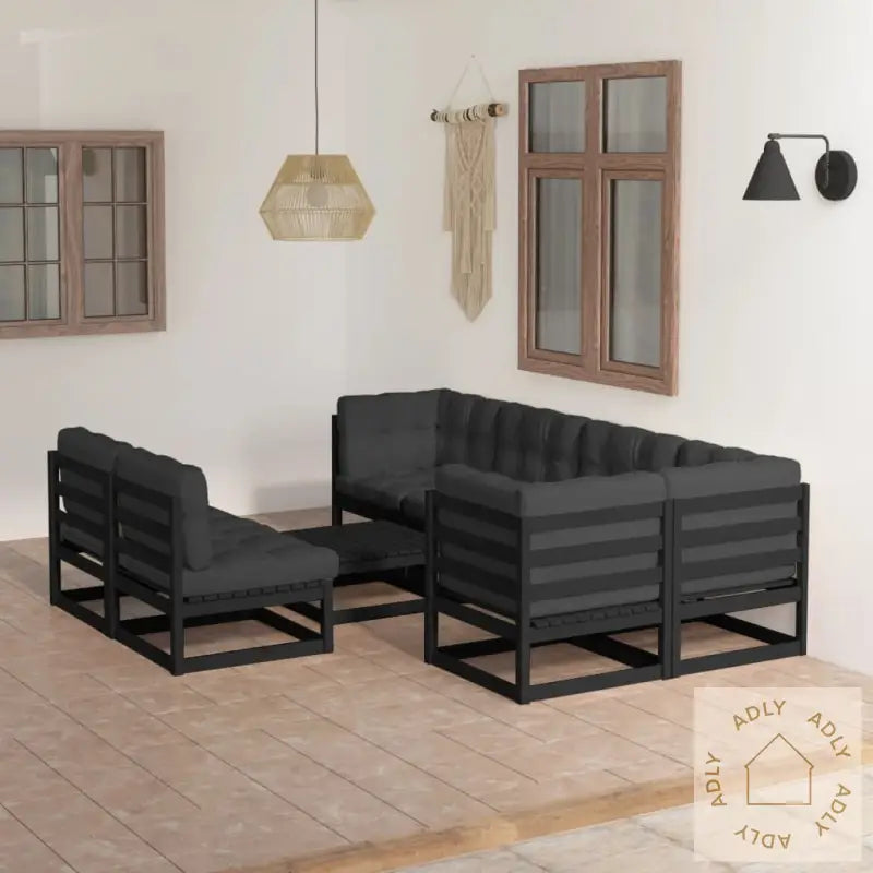 Farge: svartFarge pute: antrasittMaterialer: heltre furu, stoff (100% polyester)Mål midt-/hjørnesofa: 70 x 70 x 67 cm (B x D x H)Mål bord: 70 x 70 x 30 cm (B x D x H)Mål setepute: 70 x 70 x 8 cm (L x B x T)Mål rygg-/sidepute: 70 x 40 x 8 cm (L x B x T)Maksimal lastekapasitet (per sete): 110 kgMontering kreves: jaLeveransen inneholder:4 x midtsofaer3 x hjørnesofaer1 x bord7 x seteputer10 x rygg-/sideputer