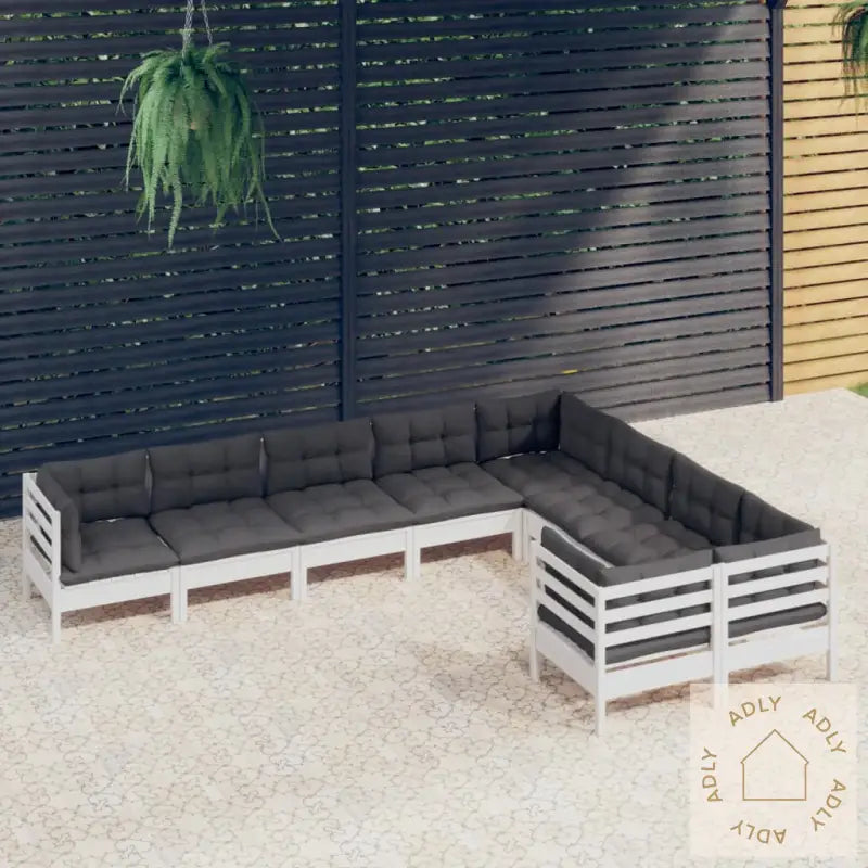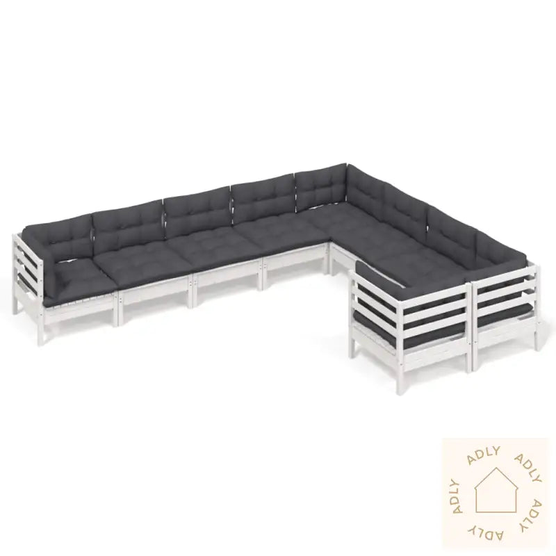 Farge: hvitFarge pute: antrasittMaterialer: heltre furu, stoff (100% polyester)Mål hjørne/mellomsofa: 63,5 x 63,5 x 62,5 cm (B x D x H)Mål setepute: 60 x 60 x 5 cm (L x B x T)Mål rygg-/sidepute: 60 x 32 x 5 cm (L x B x T)Maksimal lastekapasitet (per sete): 110 kgMontering kreves: jaLeveransen inneholder:4 x hjørnesofaer5 x midtsofaer9 x seteputer13 x rygg-/sideputer