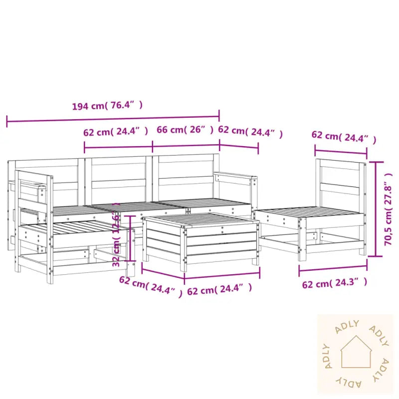 For å sikre at møblene holder seg fine over tid, anbefaler vi et vanntett trekk som beskytter mot fukt og smuss.Materiale: heltre douglasgran (ubehandlet)Materiale lameller: kryssfinerMaksimal lastekapasitet (per sete): 110 kgPute inkludert: neiMontering kreves: jaHjørnesete:Mål: 66 x 62 x 70,5 cm (B x D x H)Mål sete: 60 x 60 cm (B x D)Høyde sete fra bakken: 32 cmMidtsete:Mål: 62 x 62 x 70,5 cm (B x D x H)Mål sete: 60 x 60 cm (B x D)Høyde sete fra bakken: 32 cmMål fotskammel: 62 x 62 x 32 cm (B x D x H)Leveransen inneholder:2 x hjørneseter 3 x midtsofa 1 x fotskammel