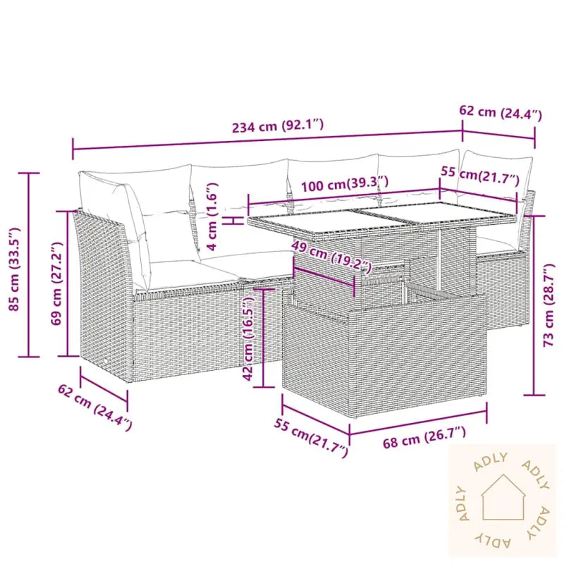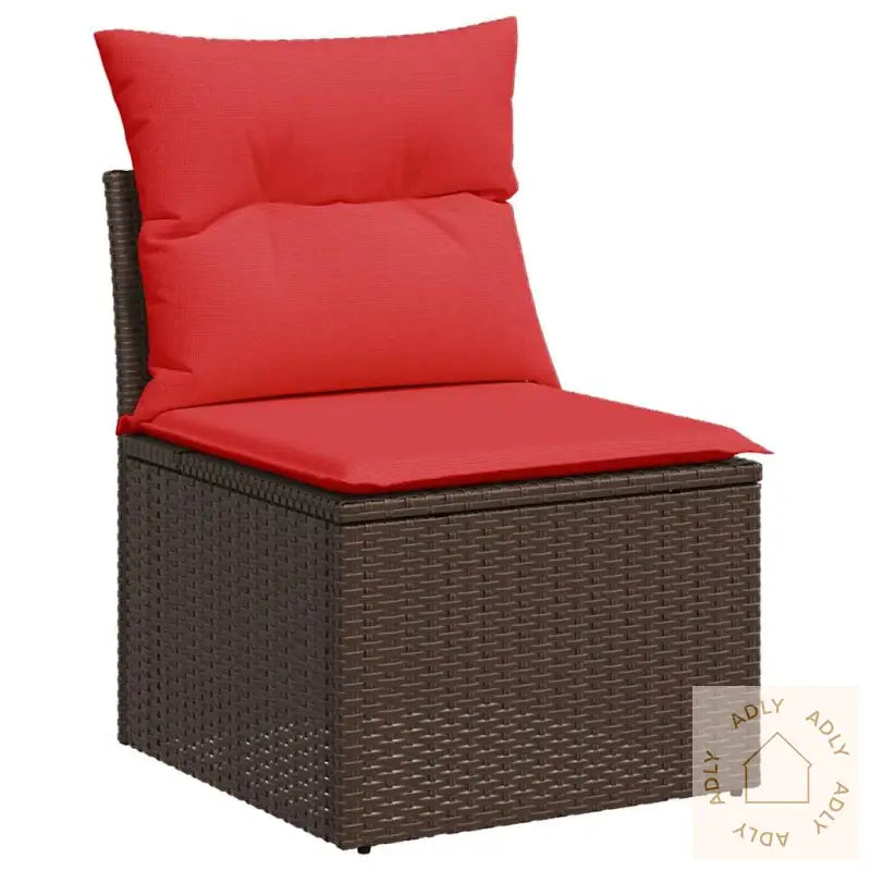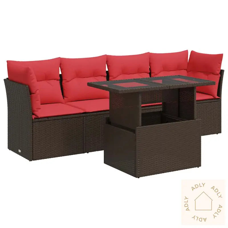 For å sikre at utemøblene dine holder seg pene år etter år, anbefales et vanntett trekk.Maksimal lastekapasitet (per sete): 110 kgUV-bestandigJusterbare føtter i plast for stabilitetMontering kreves: JaMidtsete:Farge: brunMaterialer: PE-rotting, pulverlakkert stålMål: 55 x 62 x 69 cm (B x D x H)Mål sete: 55 x 55 cm (B x D)Høyde sete fra bakken (uten pute): 37 cmVanntett pose dimensjoner: 55 x 53 x 34 cm (L x B x H)Hjørnesete:Farge: brunMaterialer: PE-rotting, pulverlakkert stålMål: 62 x 62 x 69 cm (B x D x H)Mål sete: 55 x 55 cm (B x D)Høyde sete fra bakken (uten pute): 37 cmBord:Farge: brunMaterialer: PE-rotting, pulverlakkert stål, herdet glassMål: 100 x 55 x 44/73 cm (L x B x H)Pute:Farge: rødMateriale trekk: stoff (100% polyester)Fyll setepute: skumFyllmateriale ryggpute: bomullsfiberMål setepute: 55 x 55 x 3 cm (B x D x T)Mål ryggpute: 55 x 45 x 13 cm (L x B x T)Leveransen inneholder:1 x hagebord2 x Hjørnesete inkludert oppbevaringsfunksjon med vanntett bag2 x Sentersete inkludert oppbevaringsfunksjon med vanntett bag4 x seteputer med avtagbart og vaskbart trekk6 x ryggputer
