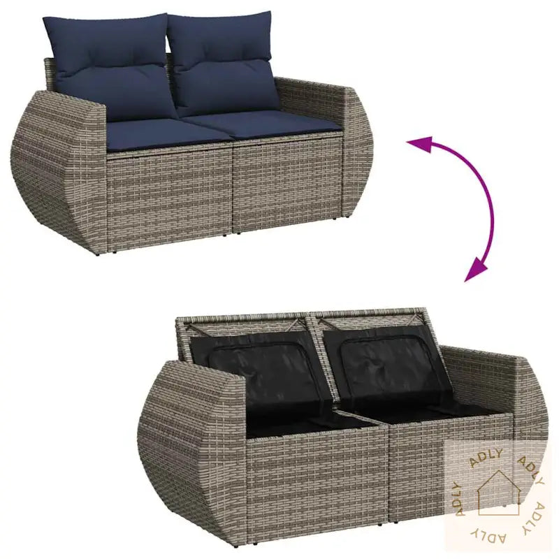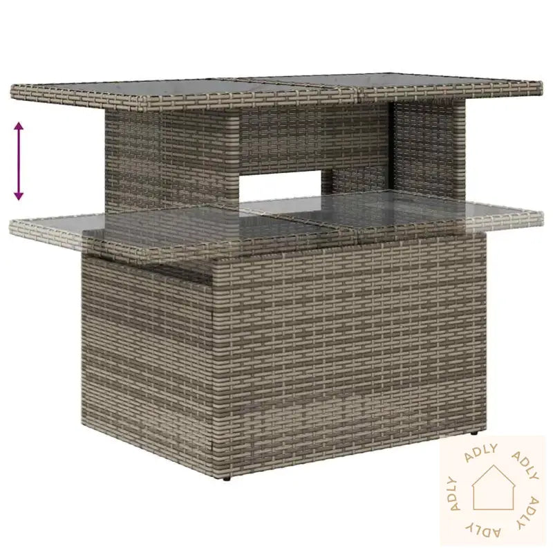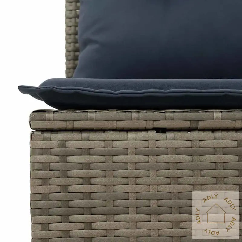 Maksimal lastekapasitet per sete: 110 kgUV-bestandig for ekstra beskyttelse mot solenJusterbare føtter i plast gir trygg og stabil plassering, selv på ujevne underlagMontering krevesMidtsete:Farge: gråMaterialer: PE-rotting kombinert med pulverlakkert stål for økt styrkeMål: 55 x 62 x 69 cm (B x D x H)Seteflate: 55 x 55 cm (B x D)Setehøyde fra bakken (uten pute): 37 cmVanntett pose: 55 x 53 x 34 cm (L x B x H) – god plass til lagring og enkel tilgang.Hjørnesete:Farge: gråMaterialer: PE-rotting og pulverlakkert stålMål: 62 x 62 x 69 cm (B x D x H)Seteflate: 55 x 55 cm (B x D)Setehøyde fra bakken (uten pute): 37 cmVanntett pose: 55 x 53 x 34 cm (L x B x H)Hjørnesete med rottingarmlener:Farge: gråMaterialer: PE-rotting og pulverlakkert stålMål: 71 x 62 x 69 cm (B x D x H)Seteflate: 55 x 55 cm (B x D)Setehøyde fra bakken (uten pute): 37 cmArmlenhøyde fra bakken: 55 cmBord:Farge: gråMaterialer: PE-rotting, pulverlakkert stål og herdet glass – solide materialer og lettstelte flater.Mål: 100 x 55 x 44/73 cm (L x B x H)Puter:Farge: marineblåTrekk: stoff i 100% polyesterSetepute: fylt med formfast skumRyggpute: mykt bomullsfiberMål setepute: 55 x 55 x 3 cm (B x D x T)Mål ryggpute: 55 x 45 x 13 cm (L x B x T)Leveransen inneholder:1 x hagebord1 x hjørnesete inkludert oppbevaringsfunksjon med vanntett bag2 x hjørnesete med rottingarmlener og vanntett bag1 x sentersete inkludert oppbevaringsfunksjon med vanntett bag4 x seteputer med avtagbart og vaskbart trekk5 x ryggputer