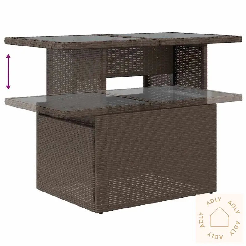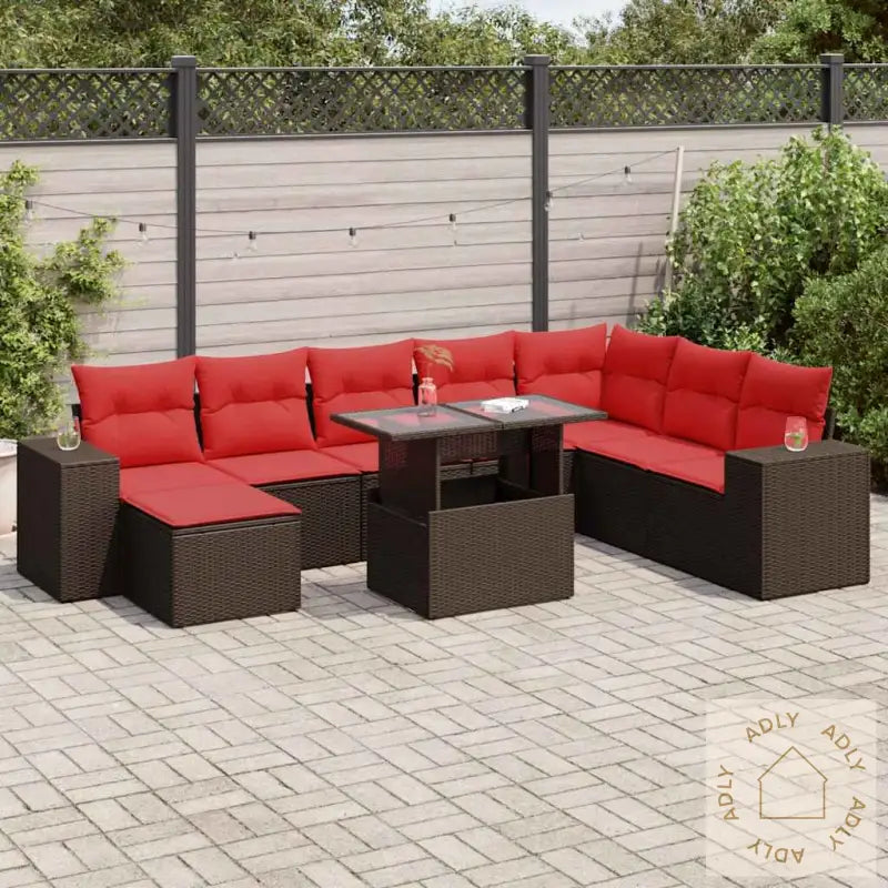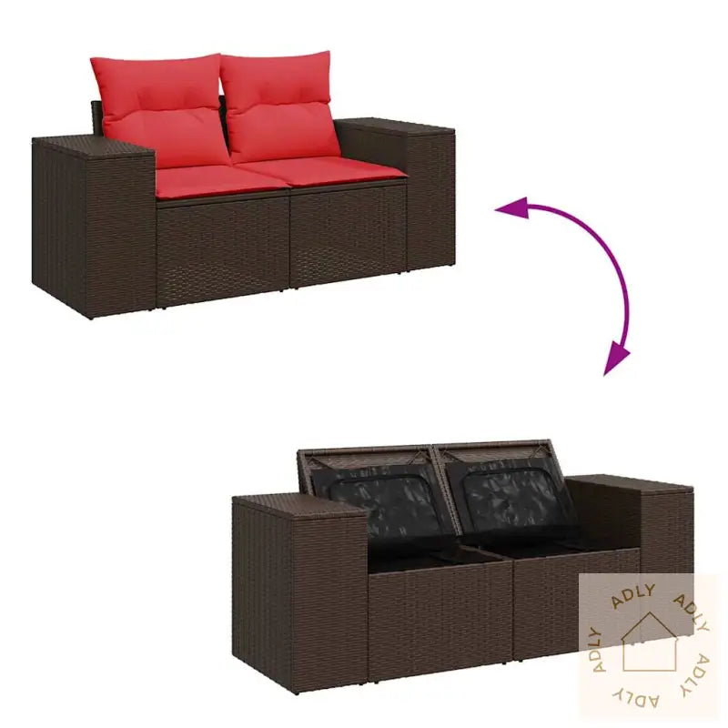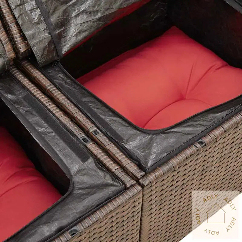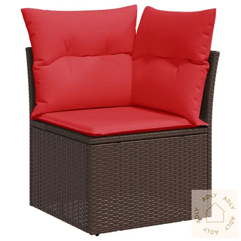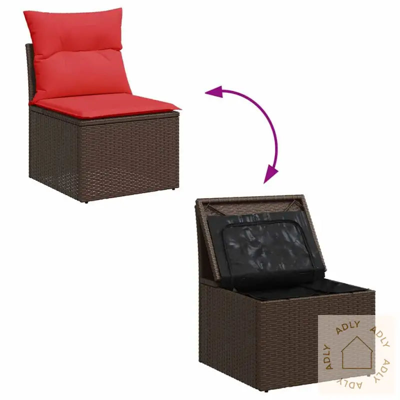 For å bevare utseendet og kvaliteten over tid anbefaler vi å bruke et vanntett trekk når møblene ikke er i bruk.Maksimal lastekapasitet per sete: 110 kgUV-bestandigJusterbare føtter i plast gir stabilitet selv på ujevnt underlagKrever monteringHjørnesete:Farge: brunMaterialer: PE-rotting, pulverlakkert stålMål: 62 x 62 x 69 cm (B x D x H)Mål sete: 55 x 55 cm (B x D)Setehøyde fra bakken uten pute: 37 cmVanntett pose mål: 55 x 53 x 34 cm (L x B x H)Midtsete:Farge: brunMaterialer: PE-rotting, pulverlakkert stålMål: 55 x 62 x 69 cm (B x D x H)Mål sete: 55 x 55 cm (B x D)Setehøyde fra bakken uten pute: 37 cmKrakk:Farge: brunMaterialer: PE-rotting, pulverlakkert stålMål: 55 x 55 x 37 cm (B x D x H)Vanntett pose mål: 55 x 53 x 34 cm (L x B x H)Hjørnesete med rottingarmlener:Farge: brunMaterialer: PE-rotting, pulverlakkert stålMål: 93 x 62 x 69 cm (B x D x H)Mål sete: 55 x 55 cm (B x D)Setehøyde fra bakken uten pute: 37 cmArmlenhøyde fra bakken: 55 cmBredde armlene: 27,5 cmMidtsete:Farge: brunMaterialer: PE-rotting, pulverlakkert stålMål: 55 x 62 x 69 cm (B x D x H)Mål sete: 55 x 55 cm (B x D)Setehøyde fra bakken uten pute: 37 cmVanntett pose mål: 55 x 53 x 34 cm (L x B x H)Pute:Farge: rødMateriale trekk: stoff (100% polyester)Fyll setepute: skumFyllmateriale ryggpute: bomullsfiberMål setepute: 55 x 55 x 3 cm (B x D x T)Mål ryggpute: 55 x 45 x 13 cm (L x B x T)Leveransen inneholder:1 x Hjørnesete med oppbevaring og vanntett bag2 x Hjørnesete med rottingarmlener og vanntett bag6 x Sentersete med oppbevaringsfunksjon og vanntett bag1 x krakk med vanntett pose9 x seteputer med avtagbart og vaskbart trekk7 x ryggputer