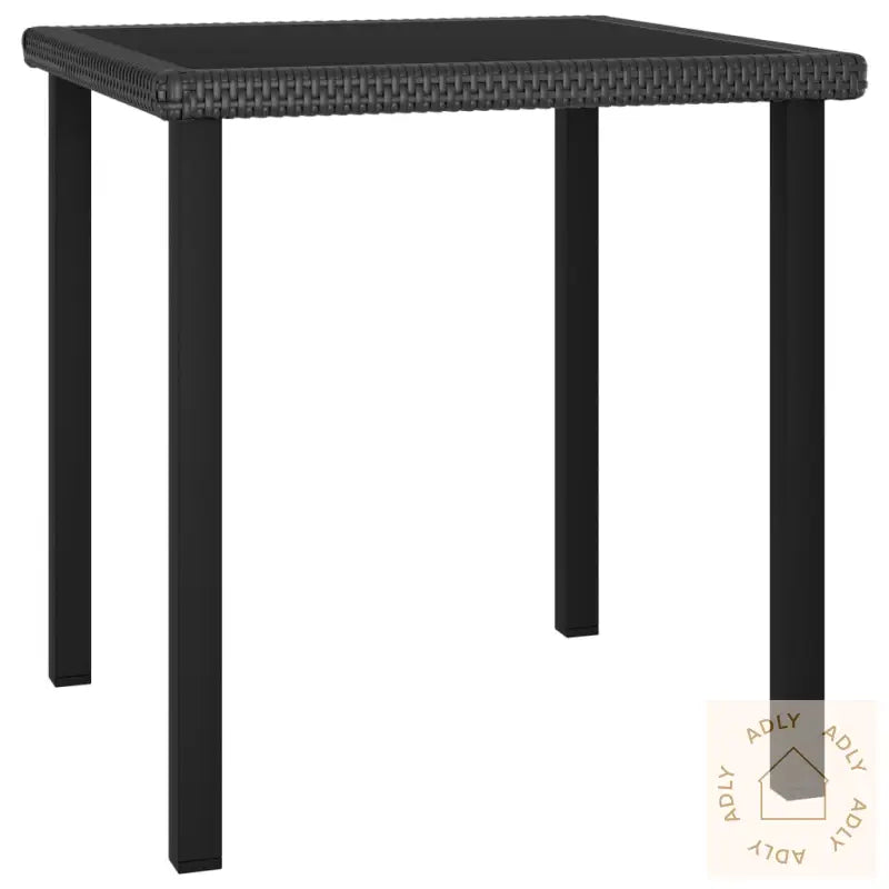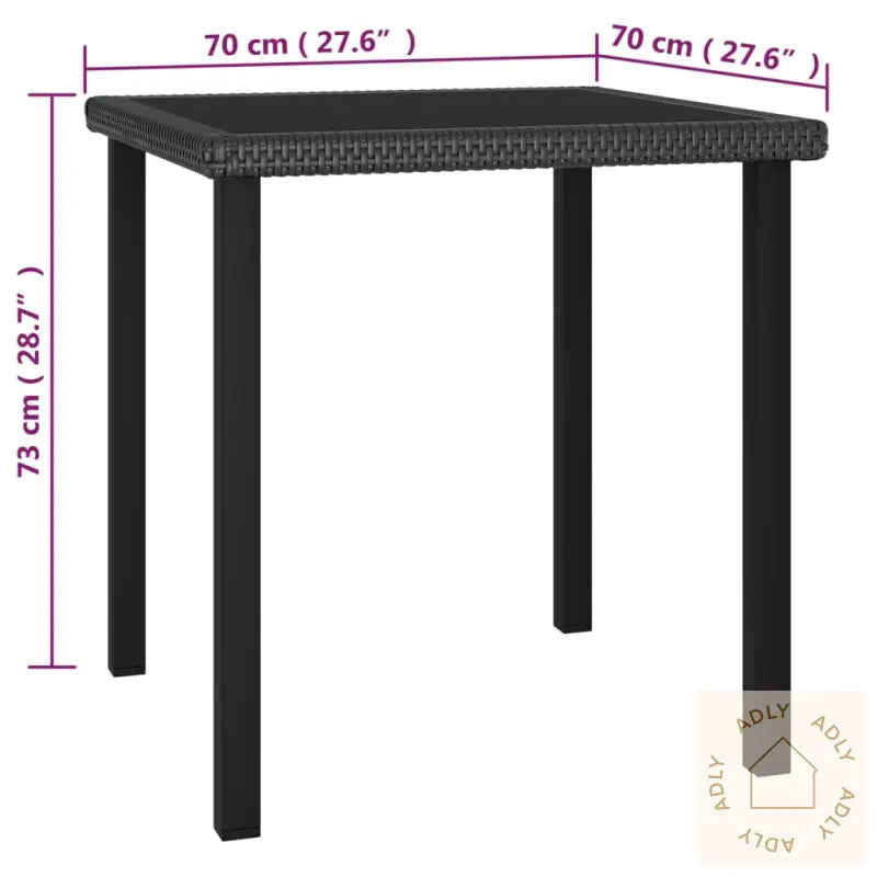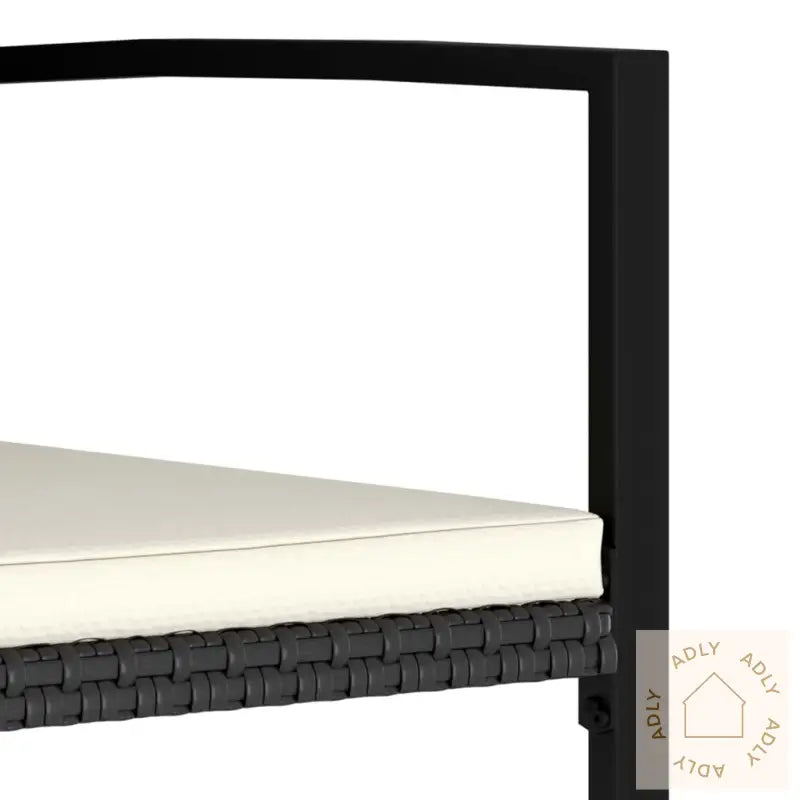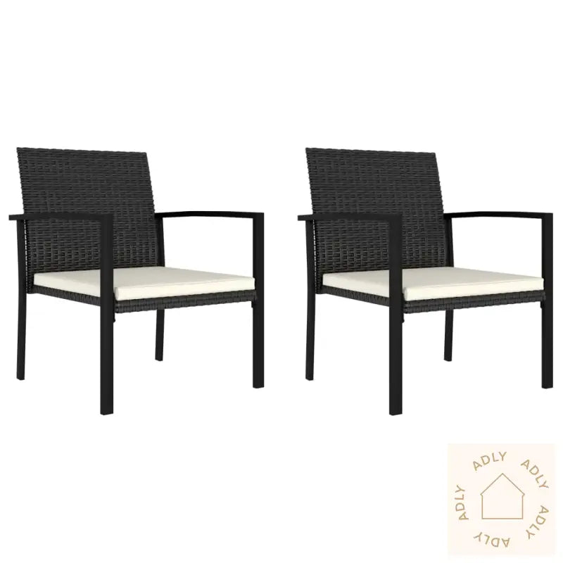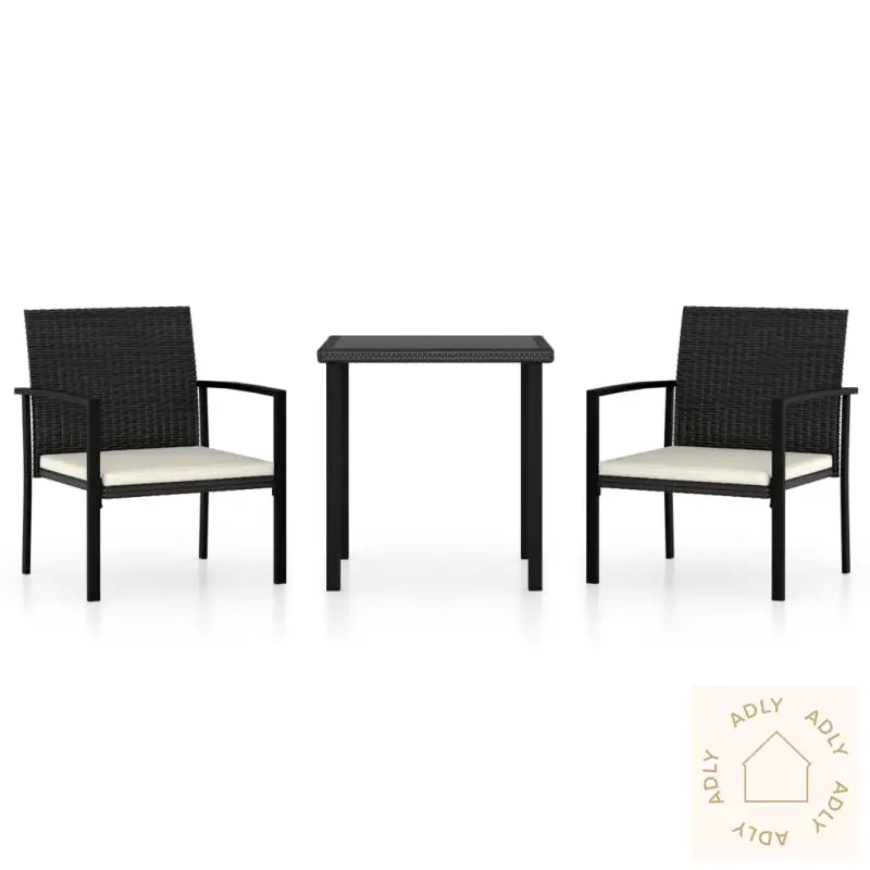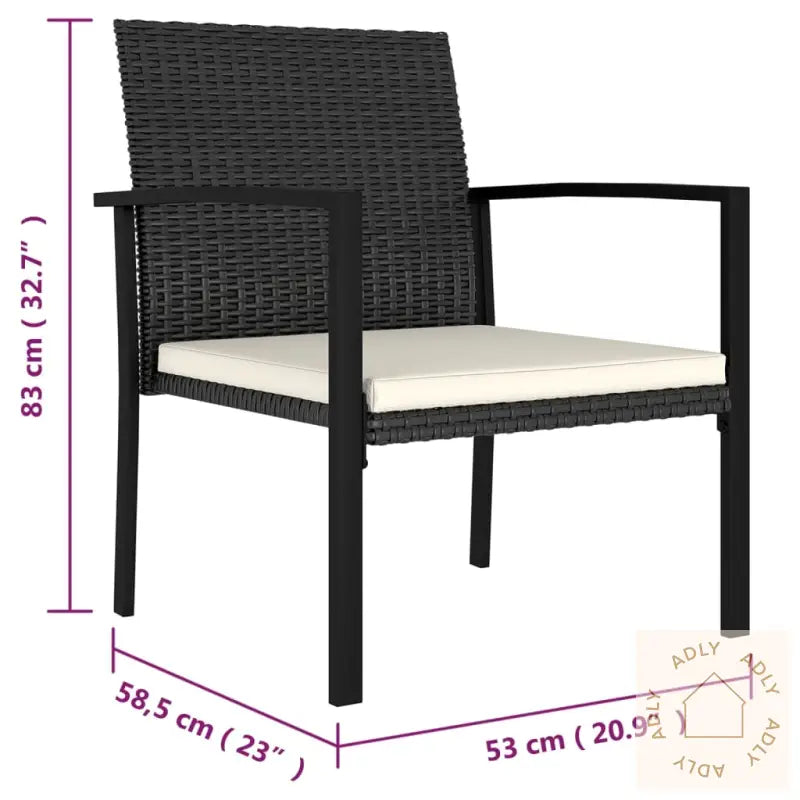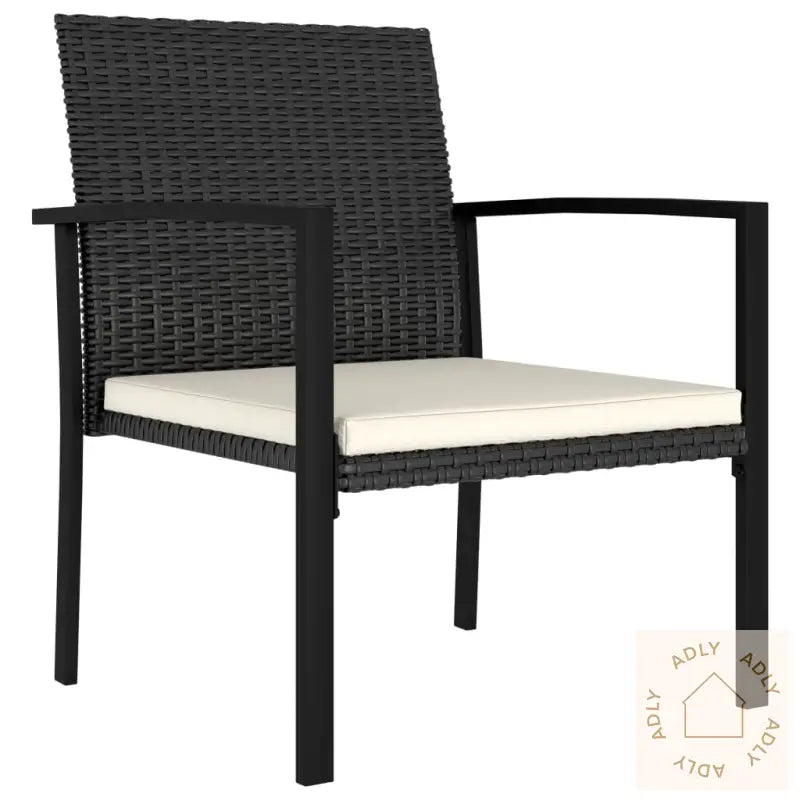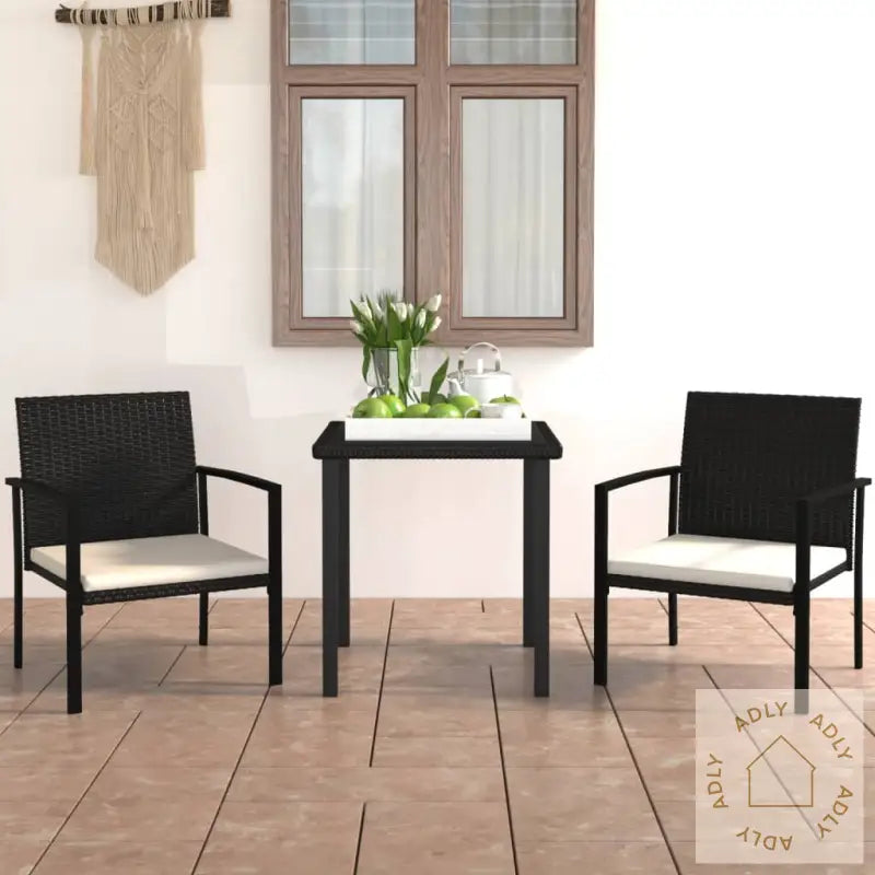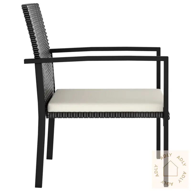 Bord:Farge: svartMaterialer: polyrotting, pulverlakkert stål, glassMål bord: 70 x 70 x 73 cm (L x B x H)Stol:Farge: svartFarge pute: kremhvitMaterialer: polyrotting, pulverlakkert stålMateriale pute: stoff (100% polyester)Mål stol: 53 x 58,5 x 83 cm (B x D x H)Mål sete: 47/41 x 45 cm (B x D)Høyde sete fra bakken: 42 cmHøyde armlene fra bakken: 61 cmTykkelse setepute: 5 cmLeveransen inneholder:1 x bord2 x stoler2 x seteputer