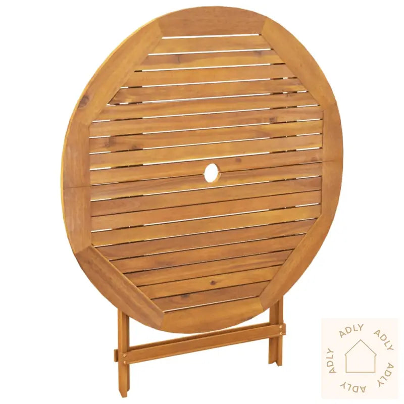 For å bevare utseendet og kvaliteten på dine utendørsmøbler anbefaler vi å beskytte dem med et vanntett trekk når de ikke er i bruk. Med riktig vedlikehold får du glede av disse hagemøblene i mange år.Bord:Materiale: oljebehandlet heltre akasieMål: 90 x 75 cm (diameter x H)Diameter parasollhull: 5 cmSammenleggbarHagestol:Farge: antrasittMaterialer: heltre akasie med oljefinish, stoff (100% polyester)Samlet mål: 41 x 52,5 x 102,5 cm (B x D x H)Mål sete: 38 x 35 cm (B x D)Høyde sete fra bakken: 44 cmMaksimal lastekapasitet (per sete): 110 kgPute inkludert: neiMontering kreves: jaLeveransen inneholder:1 x hagebord4 x hagestoler