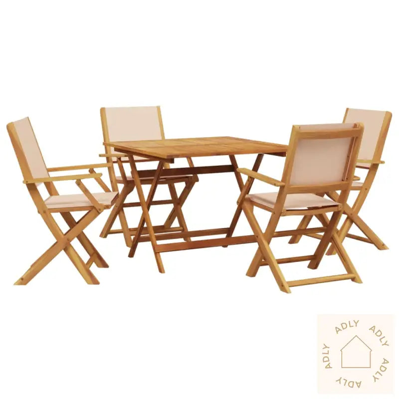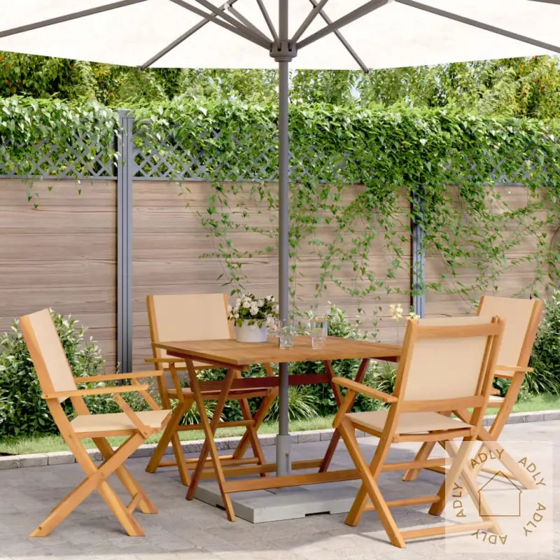For å holde dine utemøbler i heltre akasie fine år etter år, anbefaler vi å bruke et vanntett trekk.Bord:Materiale: Oljebehandlet heltre akasieMål: 90 x 90 x 75 cm (L x B x H)Diameter parasollhull: 5 cm – perfekt om du ønsker skygge på solfylte dagerSammenleggbar for enkel lagringHagestol:Farge: Beige – tidløst og passer de fleste uteområderMaterialer: Heltre akasie med oljefinish, slitesterkt stoff (100% polyester)Mål: 54 x 58 x 91 cm (B x D x H)Mål sete: 40 x 38 cm (B x D)Setehøyde fra bakken: 44 cmArmlenehøyde fra bakken: 63 cmMaksimal lastekapasitet per sete: 110 kgPute inkludert: NeiMontering kreves: JaLeveransen inneholder:1 x hagebord4 x hagestoler