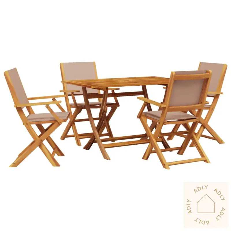 For å ha glede av dine utemøbler over tid anbefales det å bruke et vanntett trekk som beskytter mot regn og fuktighet.Bord:Materiale: oljebehandlet heltre akasie gir både lang levetid og enkel vedlikehold.Mål: 120 x 70 x 75 cm (L x B x H)Sammenleggbar for fleksibel brukHagestol:Farge: gråbrun – passer godt inn i naturelskende hagemiljøerMaterialer: heltre akasie med oljefinish og slitesterkt stoff (100% polyester)Mål: 54 x 58 x 91 cm (B x D x H)Setemål: 40 x 38 cm (B x D)Setehøyde fra bakken: 44 cmArmlenehøyde fra bakken: 63 cmMaksimal lastekapasitet per stol: 110 kgPute følger ikke medKrever monteringLeveransen inneholder:1 x hagebord4 x hagestoler