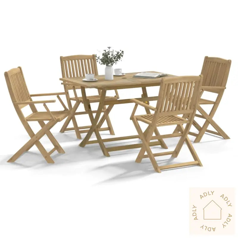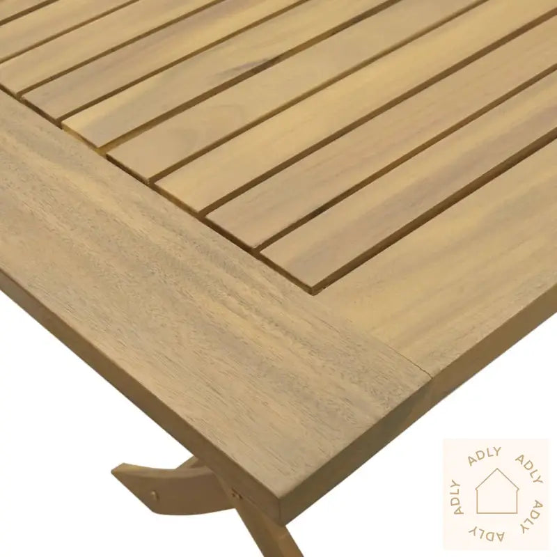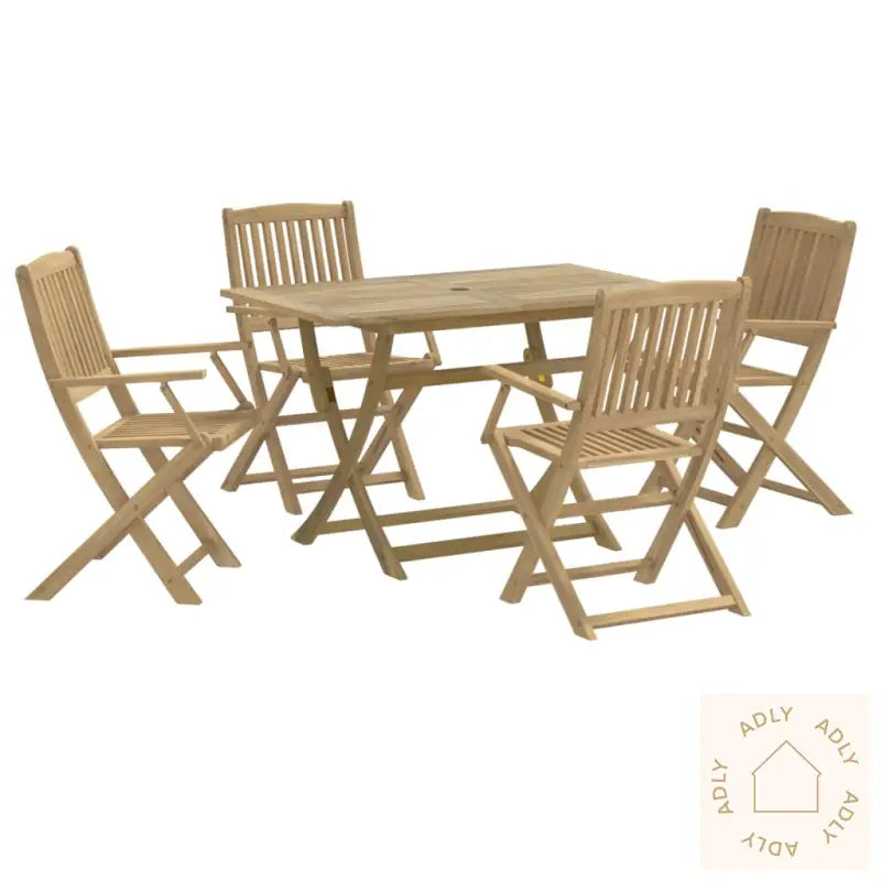 Hagemøblene er laget av heltre akasie, et robust naturmateriale med rett årring og synlige knuter som gir et rustikt preg og gjør hver del unik. Heltre akasie står kjent for sin styrke og langvarige holdbarhet, så denne gruppen tåler både vær og bruk over tid.Stolene har komfortable armlener og støttende rygg, og inviterer til lange, hyggelige sommerkvelder rundt bordet — du sitter rett og slett godt!Lamelldesignet sørger for at vann ikke samler seg på seter og bordplate, så alt tørker raskt etter regn, noe som forlenger levetiden og gjør vedlikehold enklere.Bordplaten er stabil og romslig. Den gir trygg plass til alt fra drikkevarer og snacks til fruktfat og blomsterdekor – perfekt for små og store sammenkomster. Parasollhullet i midten gjør det enkelt å tilføre skygge på solrike dager.Alle deler – bord og stoler – kan brettes sammen når de ikke er i bruk. Det gir fleksible muligheter for oppbevaring på mindre flater, og gjør det lett å flytte hagespisegruppen ved behov.Tips: For å bevare den vakre finishen og beskytte møblene dine mot vær og vind, anbefales det å bruke et vanntett trekk.