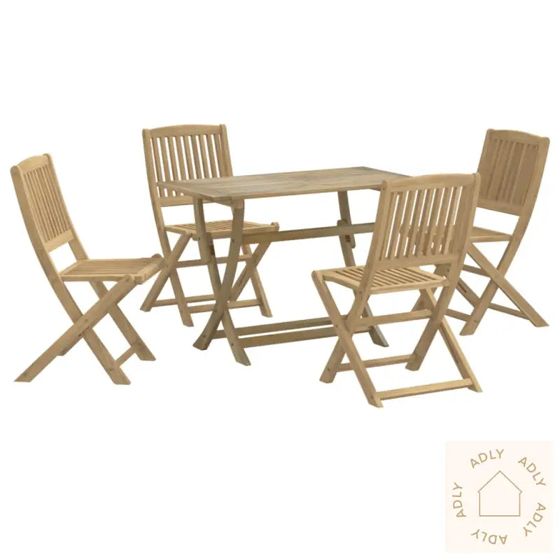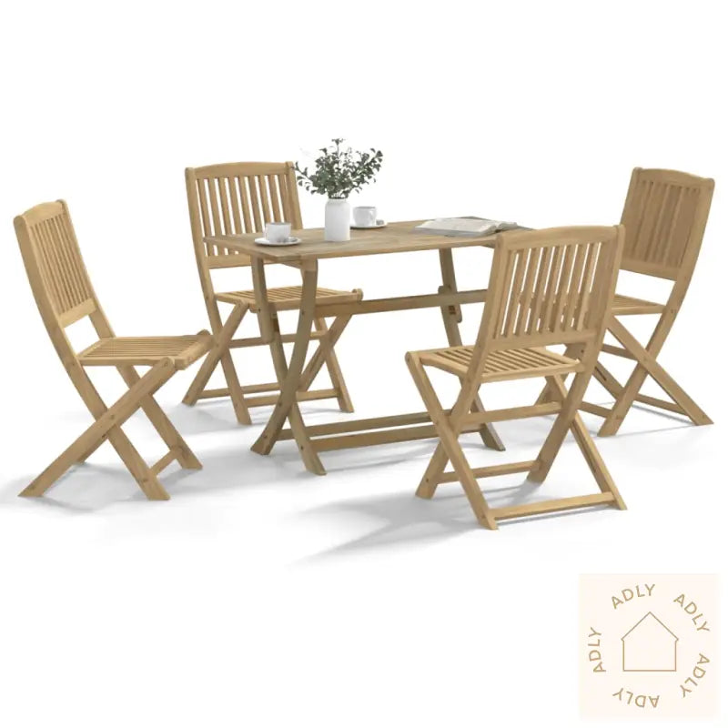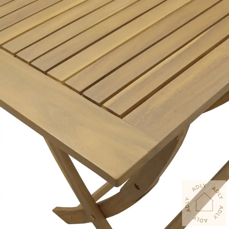 Heltre akasie gir både stabilitet og lang levetid, slik at du kan nyte uterommet år etter år. Treet har en vakker, rett årring og unike knuter som gir gruppen et naturlig og rustikt preg. Den lette finishen fremhever de varme nyansene og teksturen i akasietreet.Utestolene har komfortable armlener og ergonomisk ryggstøtte, slik at du kan lene deg godt tilbake og slappe av i flere timer rundt bordet.Lamelldesignet sørger for at regnvann renner lett av både bord og stoler. Dette holder setene tørre og forlenger levetiden på møblene ved å motvirke unødvendig slitasje som følge av fukt.Bordplaten er solid og romslig, perfekt for å servere både drikke, mat, snacks, fruktfat og dekor dersom du vil pynte opp til fest eller kos i hagen.Både spisebordet og stolene med lett finish kan enkelt foldes sammen når du ikke bruker dem. Dette gjør det superenkelt å rydde bort hagespisegruppen for sesongen eller ta den med på utflukter der det passer.Godt å vite: