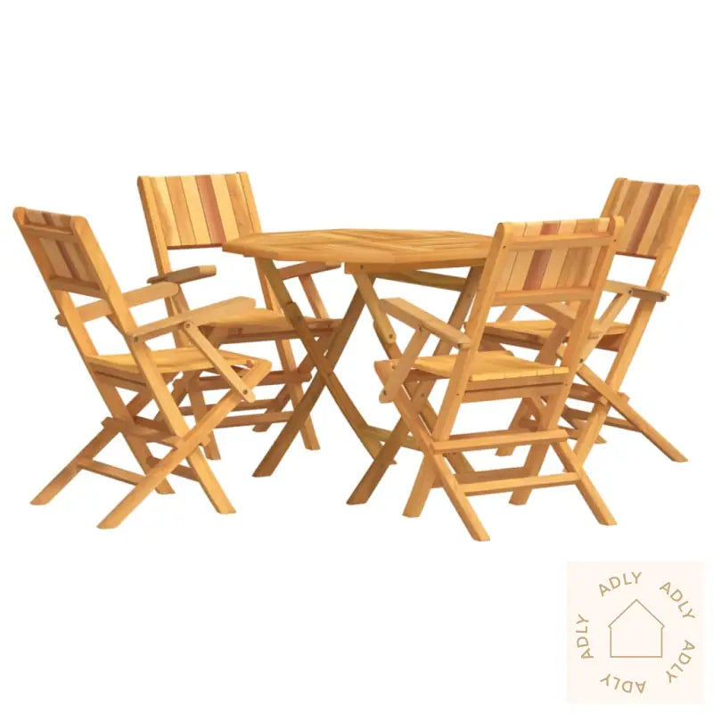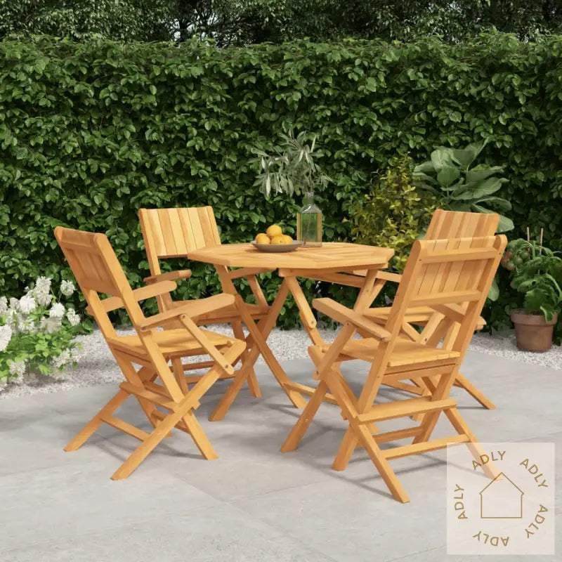 For å holde utemøblene i heltre teak med vannbasert finish like pene over tid, anbefaler vi å beskytte dem med et vanntett trekk når de ikke er i bruk.Bord:Materialer: heltre teak med vannbasert finishMål: 85 x 85 x 76 cm (L x B x H)Diameter parasollhull: 5 cmSammenleggbar hagestol:Materialer: heltre teak med vannbasert finishMål (hver): 55 x 61 x 90 cm (L x B x H)Mål sete: 41 x 43 cm (B x D)Høyde sete fra bakken: 45 cmHøyde armlene fra bakken: 67 cmMaksimal lastekapasitet (per sete): 110 kgMontering kreves: jaLeveransen inneholder:1 x bord4 x sammenleggbare hagestoler