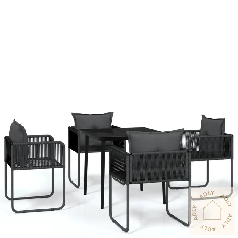 Bord:Farge: svartMaterialer: pulverlakkert stål, glassMål: 80 x 80 x 74 cm (L x B x H)Stol:Farge: svartMaterialer: PE (polyetylen) rotting, pulverlakkert stålMateriale putetrekk: 100 % polyesterMål stol: 51,5 x 51,5 x 67 cm (B x D x H)Mål ryggpute: 50 x 50 x 11 cm (L x B x T)Bredde sete: 48 cmDybde sete: 46 cmHøyde sete fra bakken: 42,5 cmMontering kreves: jaLeveransen inneholder:1 x bord4 x stoler4 x pynteputer
