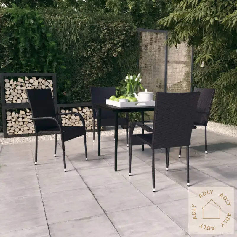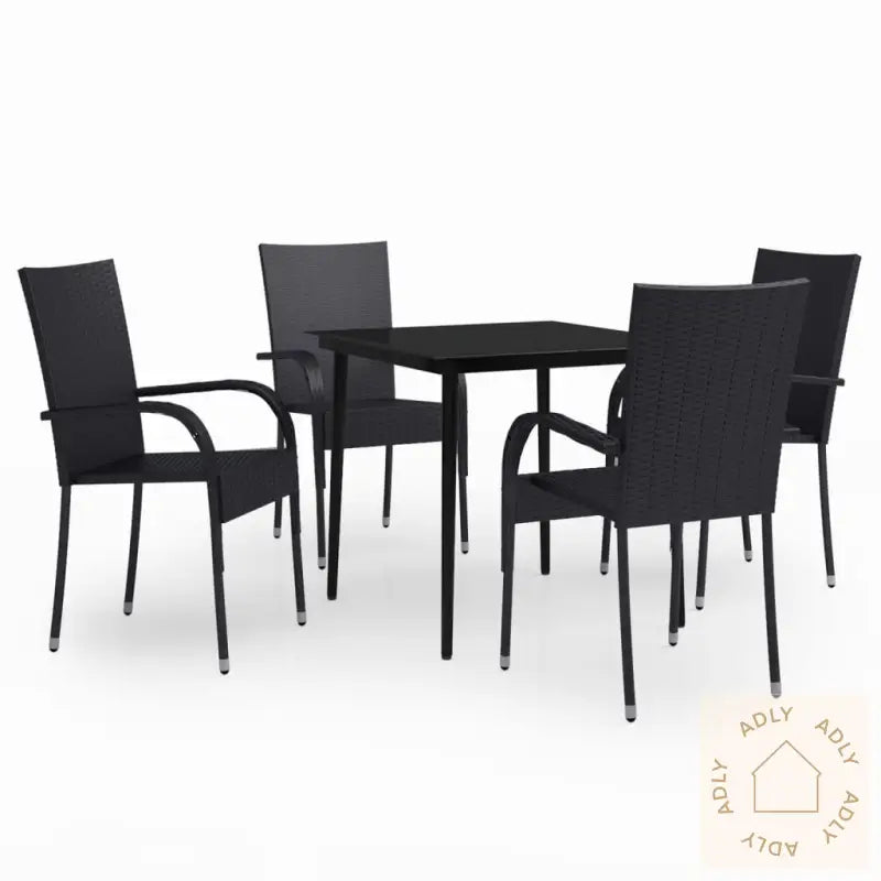 Farge: svartMaterialer: PE-rotting, pulverlakkert stål, glassMål bord: 80 x 80 x 74 cm (L x B x H)Mål: 55,5 x 53,5 x 95 cm (B x D x H)Bredde sete: 34 cmDybde sete: 43 cmHøyde sete fra bakken: 44 cmHøyde armlene fra bakken: 64 cmMontering kreves: jaLeveransen inneholder:1 x bord4 x stoler