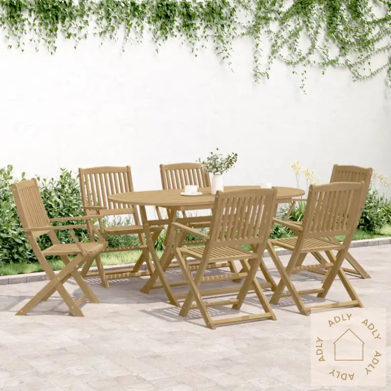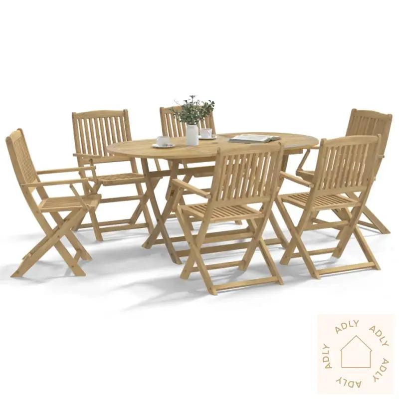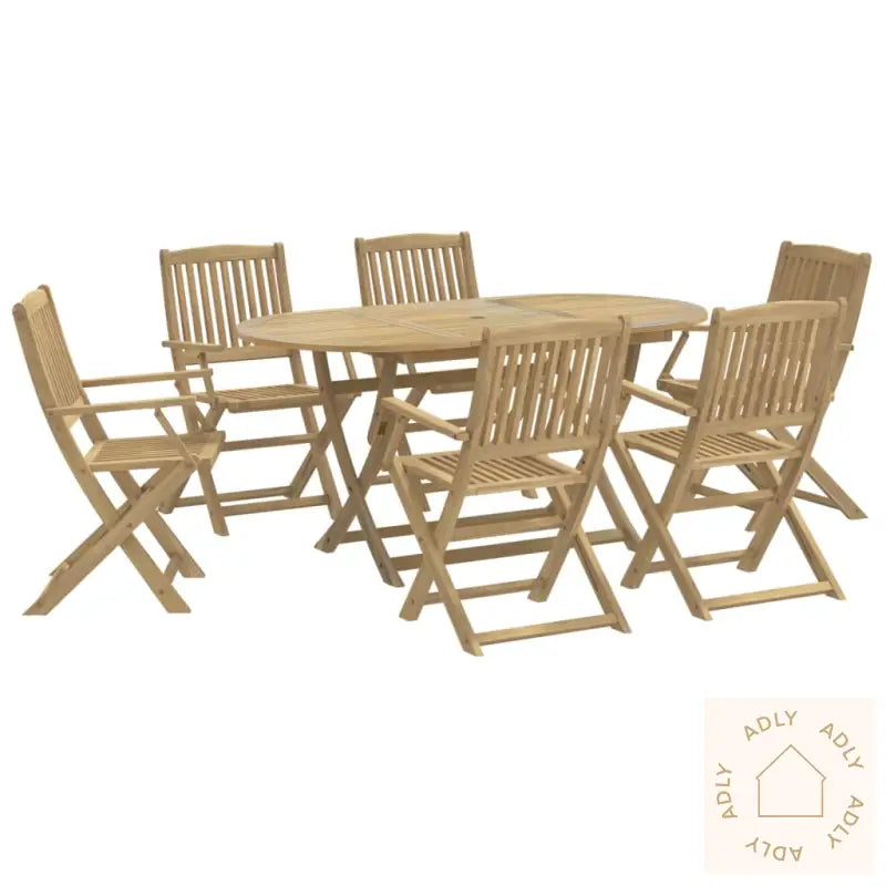 Heltre akasie gir spisegruppen styrke, lang holdbarhet og et ekte naturpreg. Akasietre har en vakker, rett årring, og naturlige knuter som gir et unikt og rustikt uttrykk hvert eneste møbel. Takket være den lette finishen kommer treverkets varme toner tydelig frem.Stolene byr på maksimal komfort med armlener og solid ryggstøtte, noe som gjør det ekstra hyggelig å sitte lenge rundt bordet – enten du nyter middag eller bare litt frisk luft.Lamelldesignet sørger for at regnvann ikke samler seg, så både stoler og bord tørker raskere etter regnskyll og holder seg pene over tid. Dette bidrar til å forhindre råte og forlenger levetiden på utemøblene dine.Bordplaten er solid og stabil, og gjør det enkelt å servere både store middagsselskap og små mellommåltider. Den romslige flaten gir plass til alt fra fruktkurv til kaffekopper og pynt, og parasollhullet gjør at du kan legge til skygge ved behov.Både bordet og stolene kan brettes sammen, slik at du sparer plass og enkelt kan oppbevare eller ta dem med deg hvis det trengs. Perfekt for den som vil ha fleksible og brukervennlige utemøbler.Godt å vite: