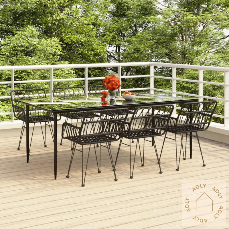Slitesterkt materiale: PE-rotting, også kjent som polyrotting, er værbestandig og robust, og gjør at disse møblene holder seg flotte lenge utendørs. Polyrotting krever lite vedlikehold og er enkel å rengjøre – tørk bare av med en fuktig klut ved behov. Dette gir deg hagemøbler som er både praktiske og ser bra ut over tid.Solid og stabil ramme: Møblene har rammer laget av stål som er pulverlakkert for ekstra beskyttelse mot rust og slitasje. Dette gir deg trygge, solide møbler til hjemmet og hagen din – perfekt for daglig bruk gjennom hele sesongen.Praktisk bordplate: Bordplaten er laget av herdet glass, et materiale som er både stilrent og ekstremt enkelt å holde rent. Herdet glass bidrar ikke bare til et moderne svart uttrykk, men gir også en sikker og robust overflate for servering av mat, drikke eller dekor.Komfortable seter: Stolene har behagelig design med ryggstøtte og armlener, slik at du kan sitte komfortabelt rundt bordet – enten det er til middagsselskap eller lange sommerdager med familien.Praktiske gummiføtter: Alle deler i bistrosettet er utstyrt med gummiføtter som sørger for stabilitet mot underlaget og beskytter terrassegulvet mot riper.Merk: