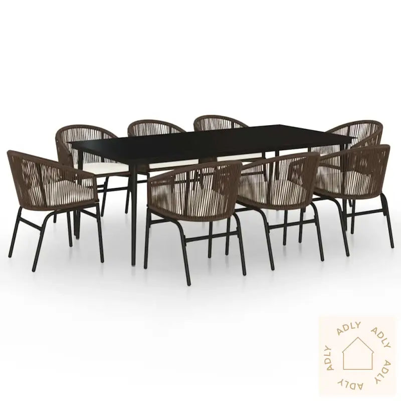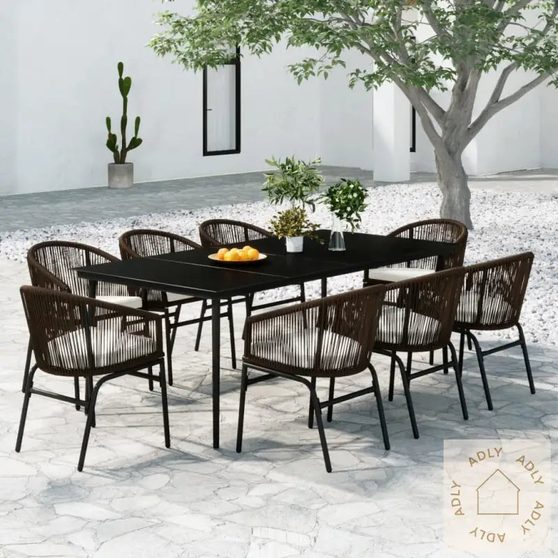 Bord:Farge: svartMaterialer: pulverlakkert stål, herdet glassMål: 200 x 100 x 74 cm (L x B x H)Tykkelse glass: 5 mmStol:Farge: brunFarge pute: kremhvitMateriale pute: stoff (100% polyester)Materialer: PVC rotting, pulverlakkert stålMål: 58 x 58 x 78 cm (B x D x H)Høyde sete fra bakken: 46 cmMontering kreves: jaLeveransen inneholder:1 x bord8 x stoler8 x seteputer