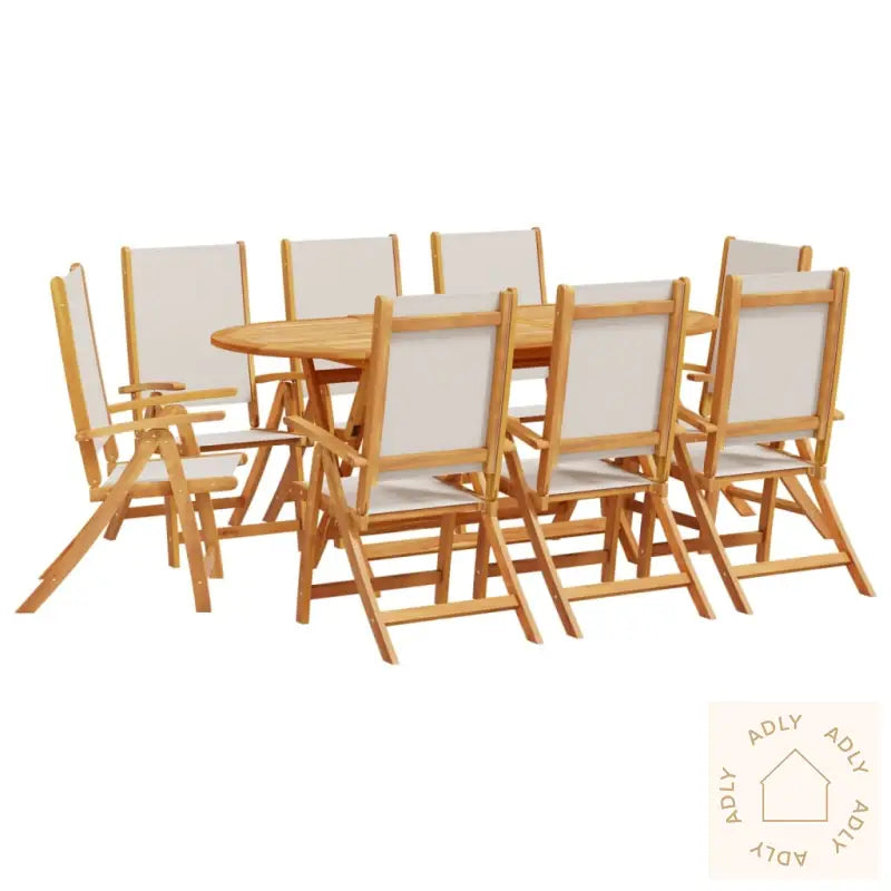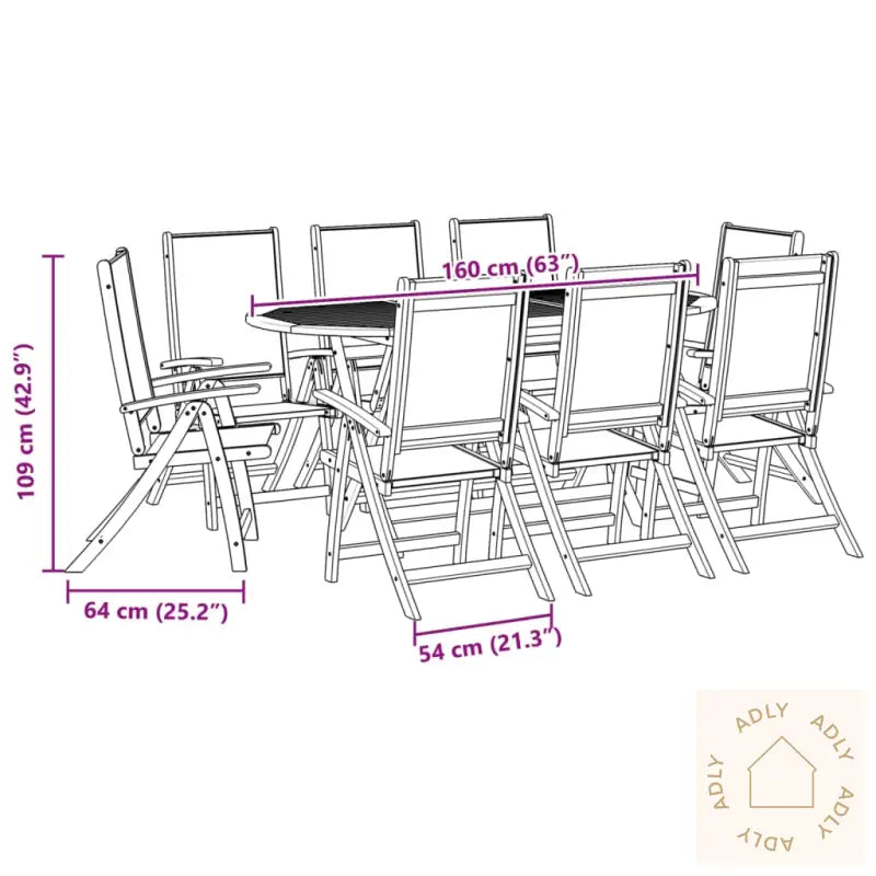 Hagebord:Materiale: oljebehandlet heltre akasieMål: 160 x 85 x 75 cm (L x B x H)Sammenleggbart design sparer plass ved lagringHagestol:Farge: gråMaterialer: heltre akasie med oljebehandling, textilene for komfortabel og slitesterk sete- og ryggflateMål: 57 x 72 x 109 cm (B x D x H)Høyde sete fra bakken: 45 cmHøyde armlene fra bakken: 66 cmTiltbar ryggstøtte med 5 innstillinger gir fleksibel brukMaksimal lastekapasitet (per sete): 110 kgMontering krevesLeveransen inneholder:1 x hagebord8 x hagestoler