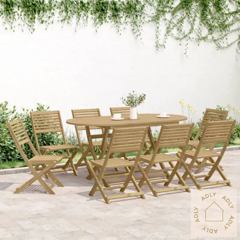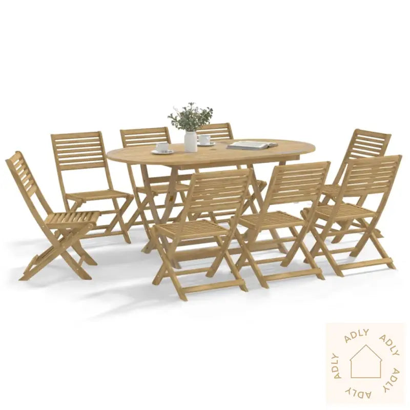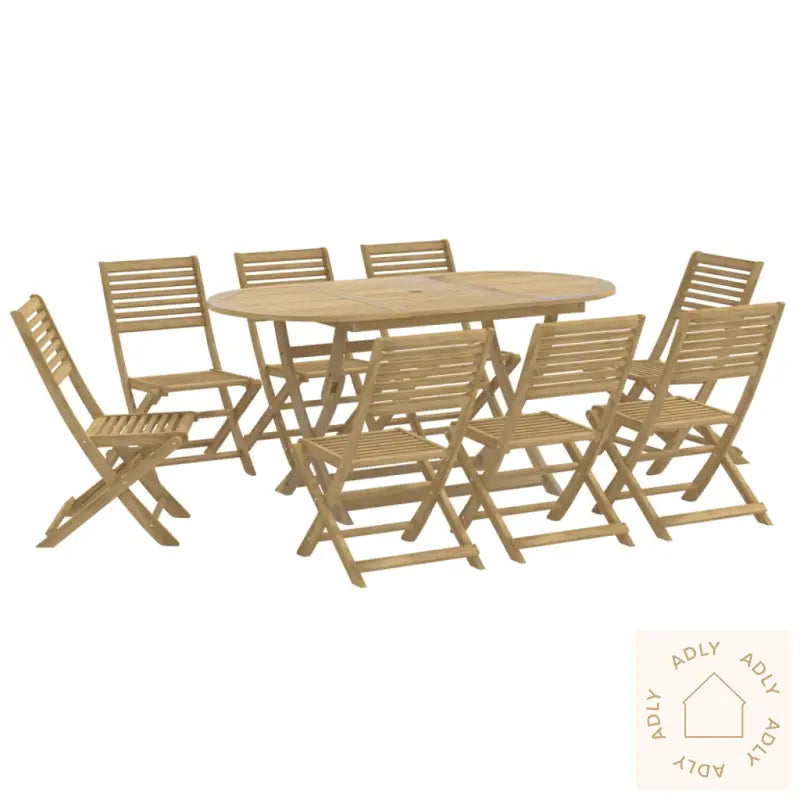 Heltre akasie: Denne hagespisegruppen er laget av heltre akasie, et solid naturmateriale kjent for sin stabilitet, holdbarhet og naturlige skjønnhet. Akasietreets rette årringer og naturlige knuter gir hvert møbel et unikt, rustikt utseende. Den lette finishen fremhever det eksklusive uttrykket, samtidig som den beskytter treverket og gjør rengjøringen enklere. Perfekt for deg som er opptatt av kvalitetsmaterialer som tåler både vær og tid.Komfortabel sitteopplevelse: Stolene har både armlener og ryggstøtte som gir god støtte når dere samles over et måltid på terrassen. Komforten gjør det lett å bli sittende lenge med familie og venner.Lamelldesign: Setene og bordplaten har gjennomført lamelldesign, noe som hindrer at vann samler seg – setet holder seg tørt, og du reduserer risikoen for råte. Du får utendørsmøbler som holder seg pene, selv etter mye bruk og regnvær.Stødig bordplate: Bordplaten i heltre akasie med lett finish gir rikelig med plass til å servere mat, drikke og dekorere bordet etter behov. En stabil overflate gjør alt lettere – enten det er til hverdagsmiddag eller sommerfest.Sammenleggbart design: Både spisebordet og stolene kan foldes sammen på få sekunder. Superpraktisk hvis du vil spare plass på vinteren eller enkelt ta settet med til hytta.Godt å vite: