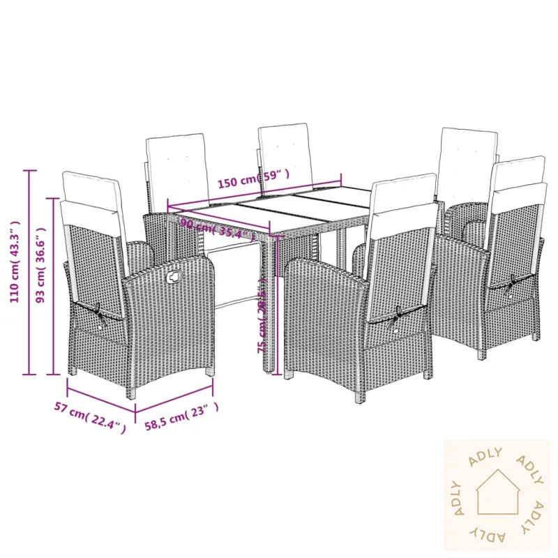 For å holde hagemøblene dine ekstra fine og beskyttet mot vær og vind, anbefaler vi å bruke et vanntett trekk når de ikke er i bruk.Stol:Farge: svartMaterialer: PE-rotting, pulverlakkert stålMål sittende: 57 x 60 x 93/110 cm (B x D x H)Mål liggende: 57 x 113 x 83 cm (B x D x H)Mål sete: 47,5 x 50 cm (B x D)Høyde sete fra bakken: 43,5 cmHøyde armlene fra bakken: 64,5 cmMaksimal lastekapasitet (per sete): 110 kgJusterbare føtter i plastUV-bestandigMontering kreves: jaBord:Farge glass: svartFarge bord: svartMaterialer: PE-rotting, pulverlakkert stål, herdet glassMål: 190 x 90 x 75 cm (L x B x H)Pute:Farge: svartMateriale trekk: stoff (100% polyester)Materiale fyll: skumMål setepute: 84 x 48 x 4 cm (B x D x T)Mål ryggpute: 65 x 48 x 4 cm (L x B x T)Leveransen inneholder:6 x hagelenestoler1 x bord6 x ryggputer6 x seteputer med avtagbart og vaskbart trekk
