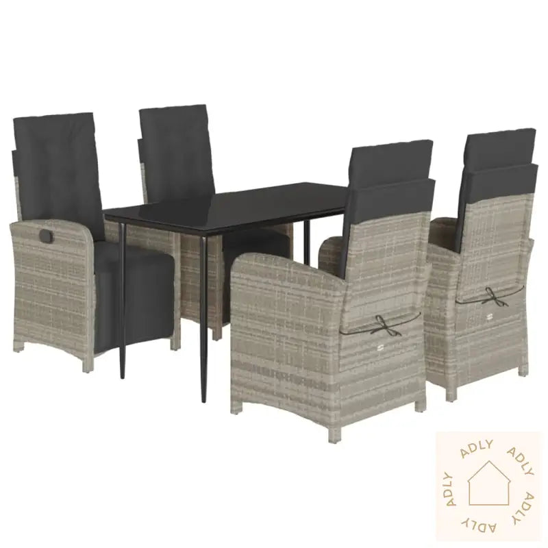 For å bevare møblenes utseende og forlenge levetiden anbefaler vi å bruke vanntett trekk når de ikke er i bruk. På den måten er hagemøblene alltid klare for neste hyggelige stund utendørs.Stol:Farge: lysegråMaterialer: PE-rotting, pulverlakkert stålMål sittende: 57 x 60 x 93/110 cm (B x D x H)Mål liggende: 57 x 113 x 83 cm (B x D x H)Mål sete: 47 x 50 cm (B x D)Høyde sete fra bakken: 43,5 cmHøyde armlene fra bakken: 64,5 cmMaksimal lastekapasitet (per sete): 110 kgJusterbare føtter i plastUV-bestandigMontering kreves: jaBord:Farge bord: svartMaterialer: PE-rotting, pulverlakkert stål, herdet glassMål: 140 x 70 x 74 cm (L x B x H)Pute:Farge: gråMateriale trekk: stoff (100% polyester)Materiale fyll: skumMål setepute: 84 x 48 x 4 cm (B x D x T)Mål ryggpute: 65 x 48 x 4 cm (L x B x T)Leveransen inneholder:4 x hagelenestoler1 x bord4 x ryggputer4 x seteputer med avtagbart og vaskbart trekk