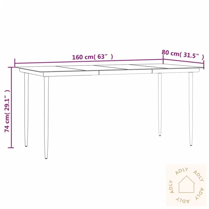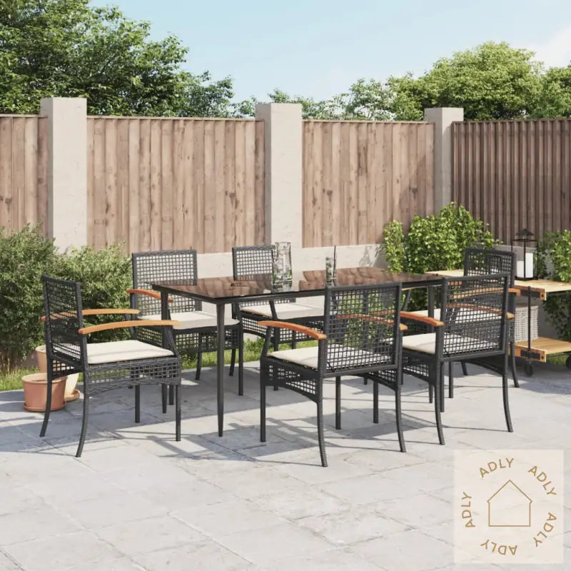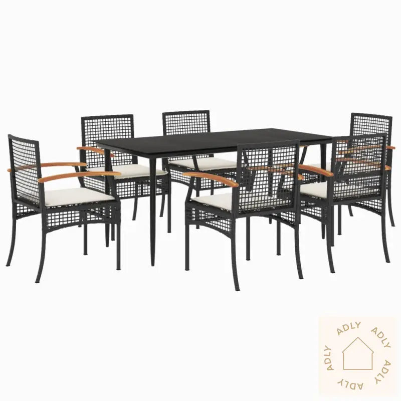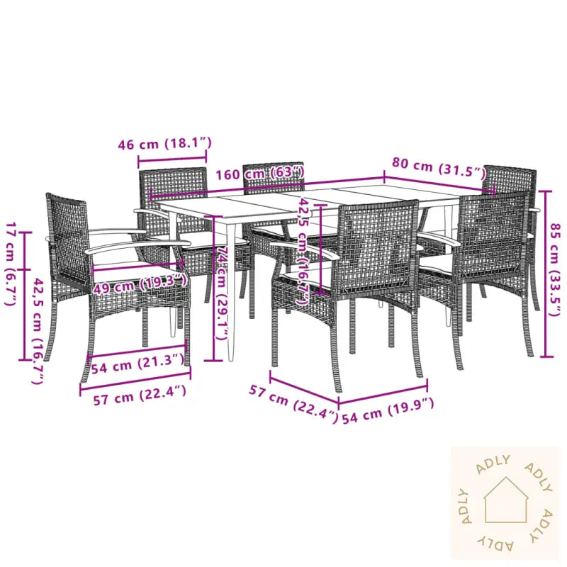 For å holde utemøblene dine pene lenger, anbefaler vi å bruke et vanntett trekk når de ikke er i bruk.Maksimal lastekapasitet per sete: 110 kgUV-bestandig overflate som beskytter mot solblekingMontering kreves: jaBord:Farge: svartMaterialer: pulverlakkert stål og herdet glassMål: 160 x 80 x 74 cm (L x B x H)Stol:Farge: svartMaterialer: PE-rotting, pulverlakkert stål, heltre akasie med oljefinishMål: 54 x 57 x 85 cm (B x D x H)Mål sete: 46,5 x 49 cm (B x D)Høyde sete fra bakken: 42,5 cmHøyde armlene fra bakken: 59,5 cmPute:Farge: kremhvitMateriale trekk: stoff (100% polyester)Materiale fyll: skumMål benkpute: 100 x 48 x 3 cm (B x D x T)Mål stolpute: 46 x 48 x 3 cm (B x D x T)Leveransen inneholder:1 x hagebord6 x hagestoler6 x stolputer med avtagbart og vaskbart trekk