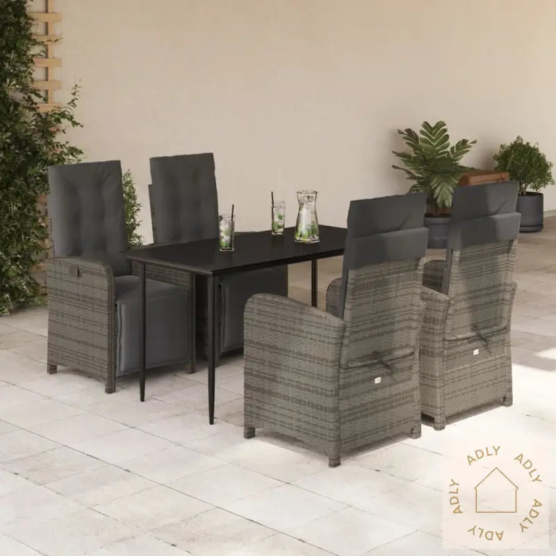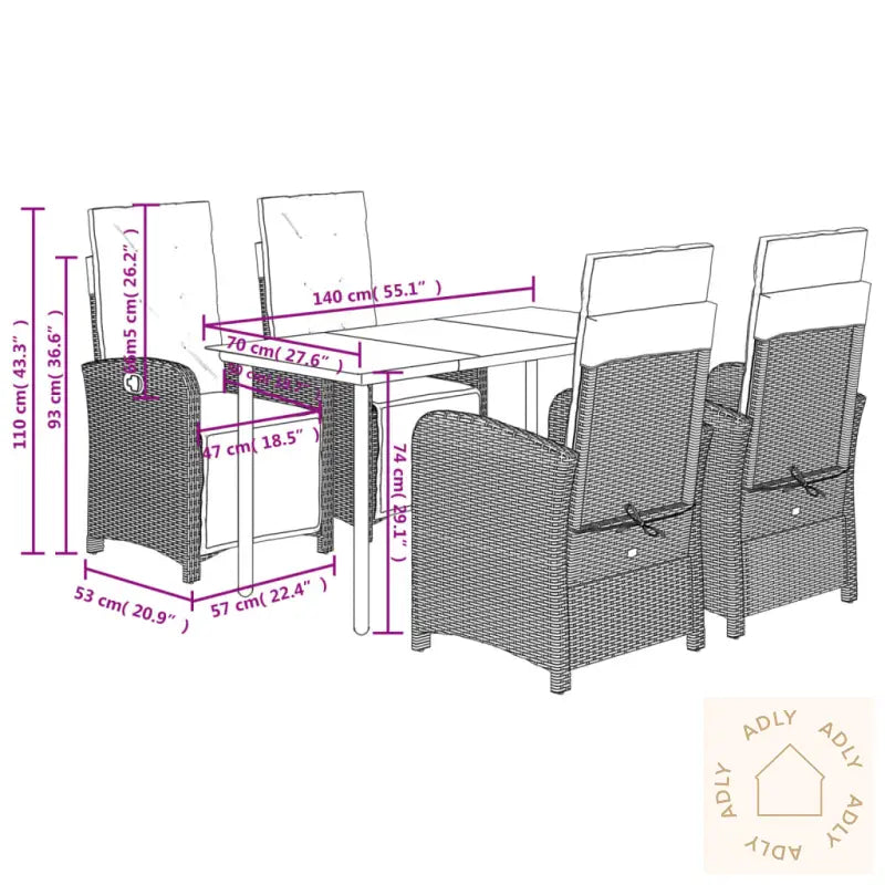 For å bevare utseendet til dine nye hagemøbler best mulig, anbefaler vi å bruke et vanntett trekk når de ikke benyttes.Stol:Farge: gråMaterialer: PE-rotting, pulverlakkert stålMål sittende: 57 x 60 x 93/110 cm (B x D x H)Mål liggende: 57 x 113 x 83 cm (B x D x H)Mål sete: 47 x 50 cm (B x D)Høyde sete fra bakken: 43,5 cmHøyde armlene fra bakken: 64,5 cmMaksimal lastekapasitet (per sete): 110 kgJusterbare føtter i plastUV-bestandigMontering kreves: jaBord:Farge bord: svartMaterialer: PE-rotting, pulverlakkert stål, herdet glassMål: 140 x 70 x 74 cm (L x B x H)Pute:Farge: mørkegråMateriale trekk: stoff (100% polyester)Materiale fyll: skumMål setepute: 84 x 48 x 4 cm (B x D x T)Mål ryggpute: 65 x 48 x 4 cm (L x B x T)Leveransen inneholder:4 x hagelenestoler1 x bord4 x ryggputer4 x seteputer med avtagbart og vaskbart trekk