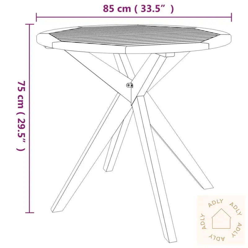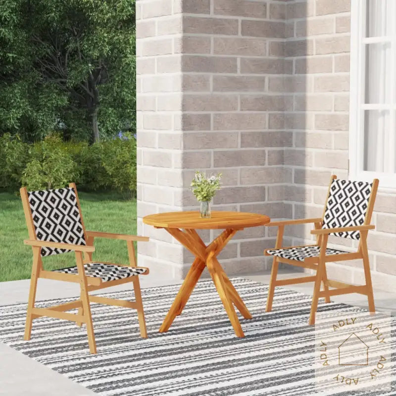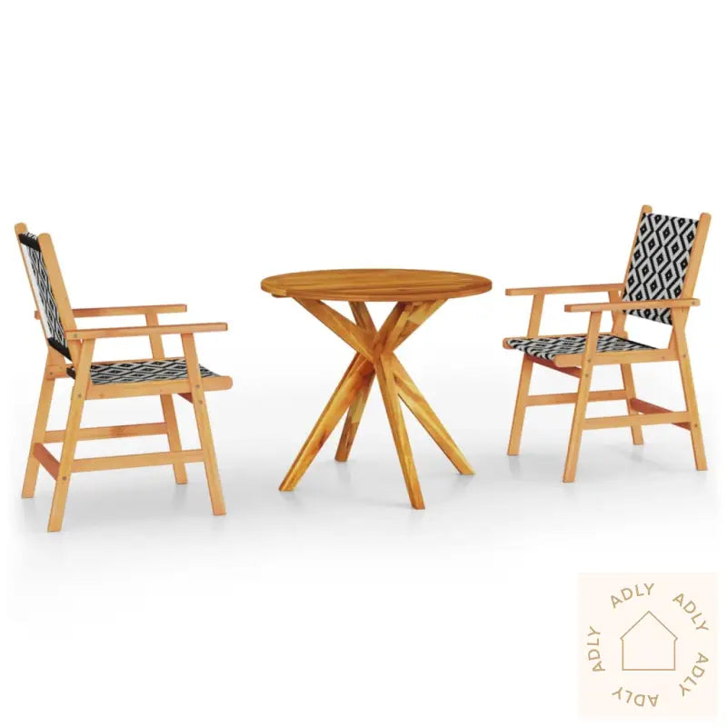 Bord:Materiale: heltre akasie med oljebehandlingMål: 85 x 75 cm (Diameter x Høyde)Stol:Materialer: heltre akasie, polyrottingMål: 56 x 62 x 92 cm (Bredde x Dybde x Høyde)Setehøyde fra bakken: 45 cmArmlenehøyde fra bakken: 63 cmMontering kreves: jaLeveransen inneholder:1 x bord2 x stoler