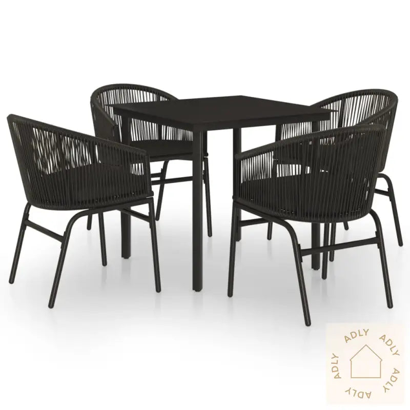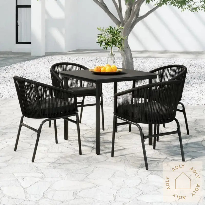 Bord:Farge: svartMaterialer: pulverlakkert stål, glassMål: 80 x 80 x 74 cm (L x B x H)Stol:Farge: svartMaterialer: PVC rotting, pulverlakkert stålMateriale pute: stoff (100% polyester)Mål: 58 x 58 x 78 cm (B x D x H)Høyde sete fra bakken: 46 cmMontering kreves: jaLeveransen inneholder:1 x bord4 x stoler4 x seteputer