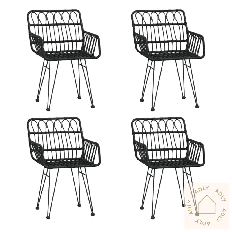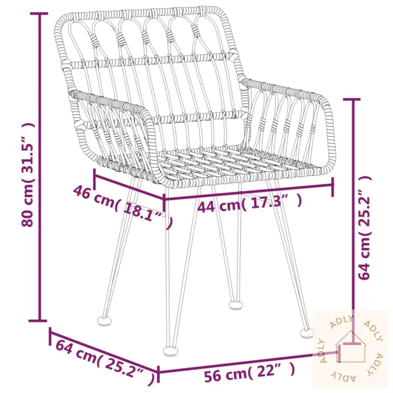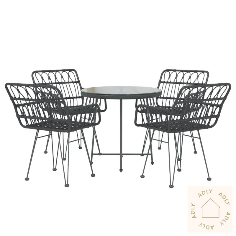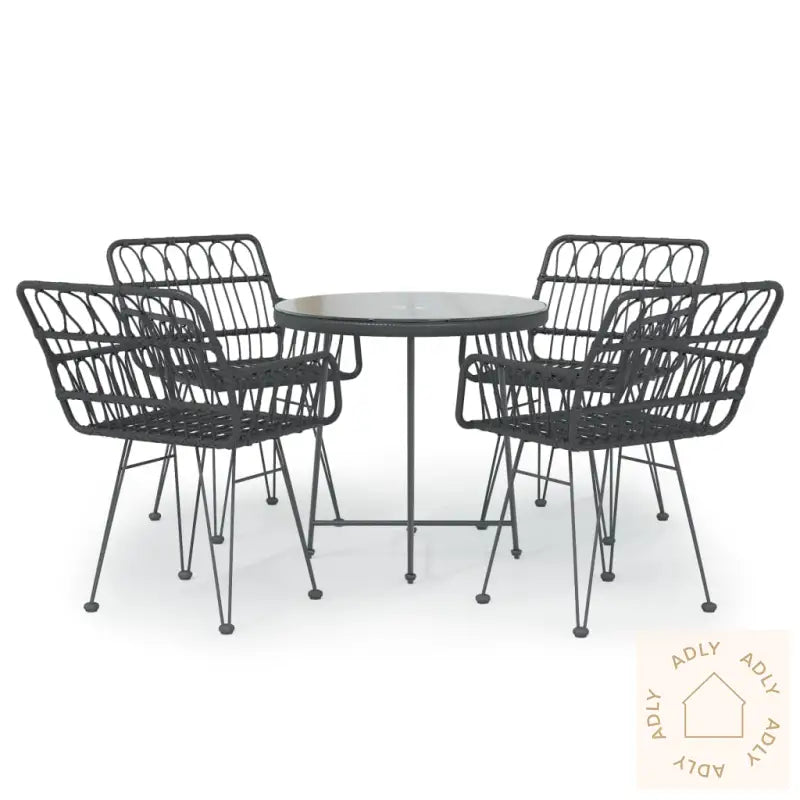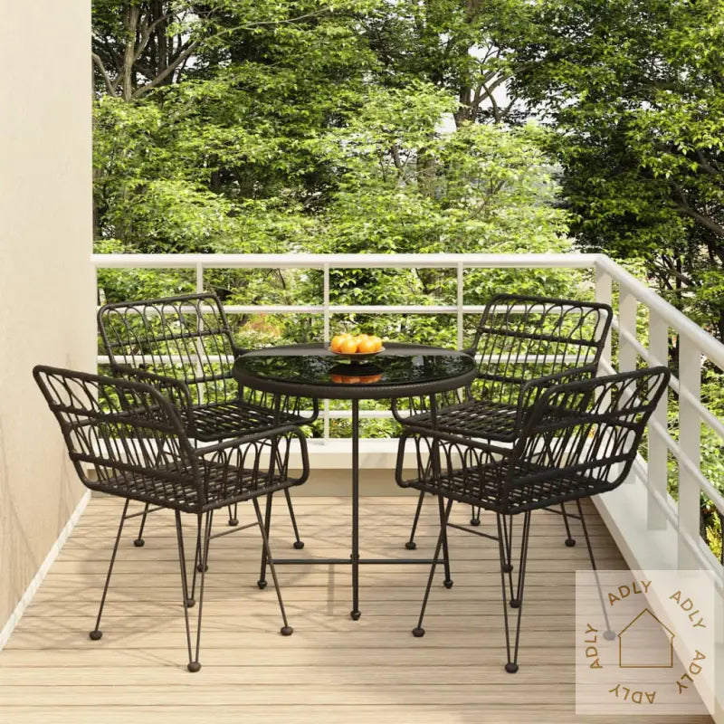Slitesterkt materiale: PE-rotting (polyrotting) sørger for at møblene tåler vær og vind, og er utrolig enkle å holde pene. Materialet ser naturlig ut med sitt autentiske rottingutseende, men gir samtidig økt slitestyrke og lang levetid. Med dette får du utemøbler som holder seg flotte år etter år, uten mye vedlikehold.Solid og stabil ramme: Settet er utstyrt med sterke stålrammer som gir god støtte og stabilitet til daglig bruk utendørs. Dette gir deg robuste hagemøbler som passer perfekt på terrassen eller i hagen.Praktisk bordplate: Bordplaten i herdet glass gir et elegant preg samtidig som den er lett å rengjøre – du tørker enkelt over med en fuktig klut. Herdet glass er kjent for å være både solid og trygg, så du kan trygt plassere måltider, kalde drikker eller dekorasjoner der.Komfortable seter: Spisestolene har integrert ryggstøtte og armlener for ekstra komfort, perfekt for lange, hyggelige kvelder ute. Det gir deg og gjestene dine en avslappende sitteopplevelse.Praktiske gummiføtter: Alle deler står stødig med gummiføtter, slik at både bord og stoler står godt på underlaget og unngår å ripe opp terrassegulvet ditt.Merk: