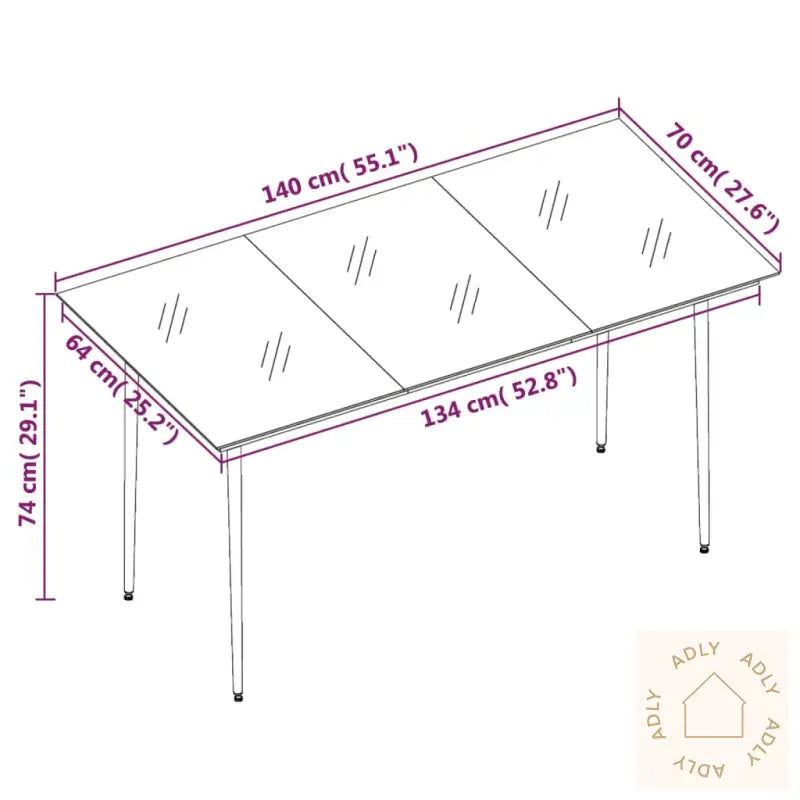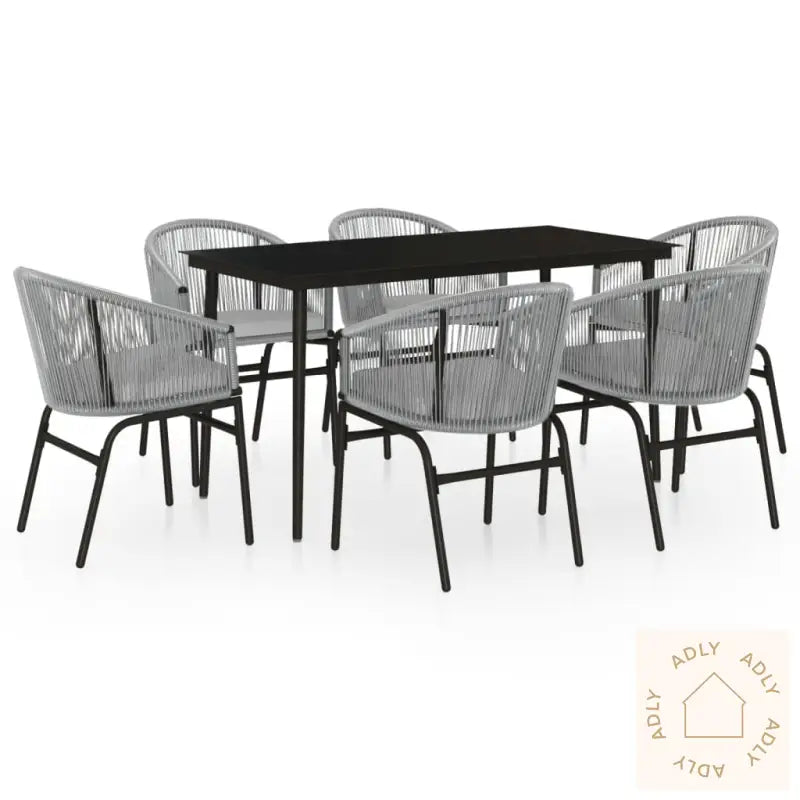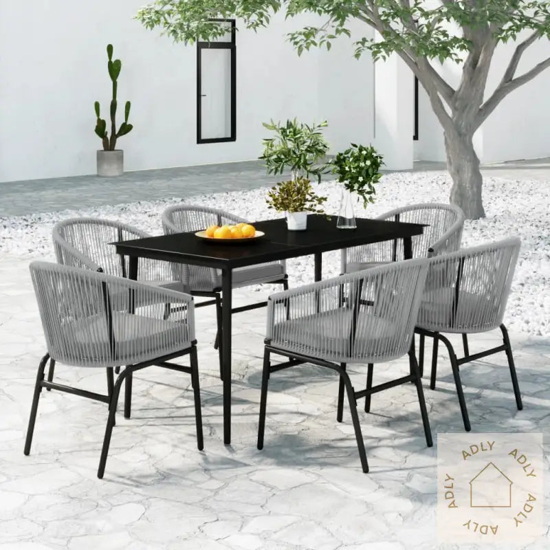 Bord:Farge: SvartMaterialer: Pulverlakkert stål, glassMål: 140 x 70 x 74 cm (L x B x H)Stol:Farge: GråMaterialer: PVC-rotting, pulverlakkert stålMateriale pute: Stoff (100% polyester)Mål: 58 x 58 x 78 cm (B x D x H)Høyde sete fra bakken: 46 cmMontering kreves: jaLeveransen inneholder:1 x bord6 x stoler6 x seteputer