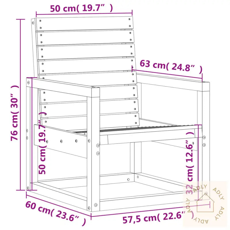 Materiale: Heltre douglasgran (ubehandlet)Mål: 57,5 x 63 x 76 cm (B x D x H)Mål sete: 50 x 60 cm (B x D)Høyde sete fra bakken: 32 cmHøyde armlene fra bakken: 50 cmMaksimal lastekapasitet: 90 kgMontering kreves: jaPute inkludert: nei