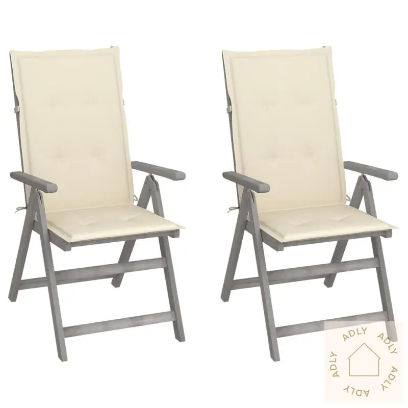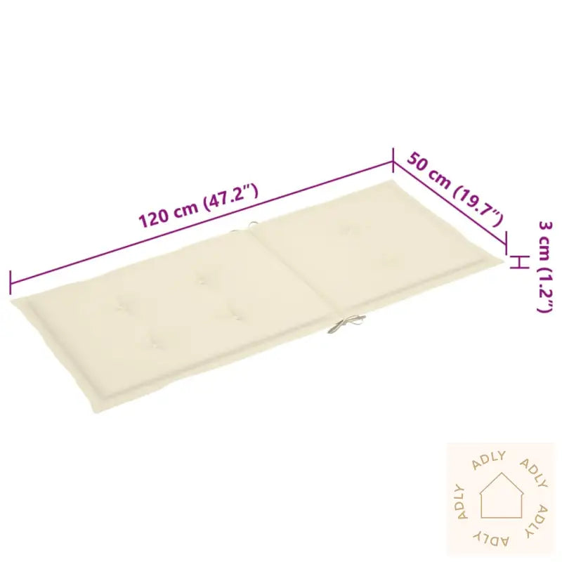 Farge pute: kremhvitMateriale stol: heltre akasie med gråvasket finishMateriale pute: stoff (100% polyester)Mål stol: 57 x 69 x 110 cm (B x D x H)Mål på pute: 120 x 50 x 3 cm (L x B x H)Kan tilbakelenes i 5 posisjonerPuten har en elastisk stropp og 2 sett med tauMontering kreves: jaLeveransen inneholder:2 x stoler med pute