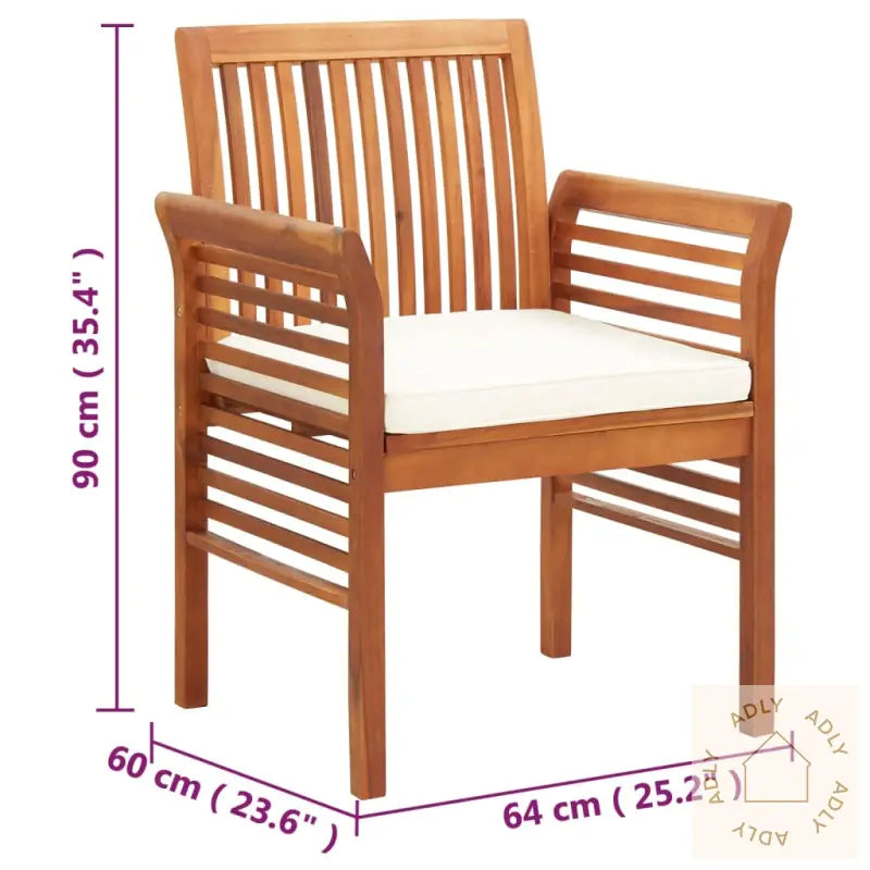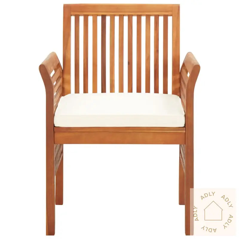 Premium heltre: Stolene er produsert i heltre akasie, et tropisk løvtre kjent for sin naturlige skjønnhet, solide struktur og lange holdbarhet. Akasie tåler både vær og vind godt, noe som gjør disse spisestolene ideelle som utemøbler.Komfortabelt design: Den ergonomiske utformingen med buede ryggstøtter og armlener gjør at du kan slappe av på uteplassen time etter time, samtidig som kroppen får god støtte.Komfortable puter: De tykke, avtakbare setepunene i kremhvit polyester gjør det ekstra mykt å sitte lenge, og gir en lun følelse når du nyter sommeren.Merk: