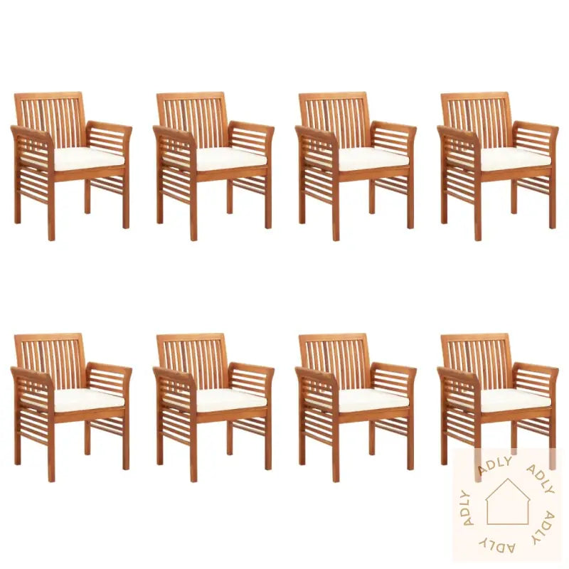 For å bevare kvaliteten og forlenge levetiden til dine hagemøbler anbefales det å beskytte dem med et vanntett møbeltrekk når de ikke er i bruk.Alle stolene leveres med enkel og oversiktlig monteringsveiledning.Farge pute: KremhvitMateriale stol: Heltre akasie med oljefinishMateriale pute: Stoff (100% polyester)Materiale putefyll: SkumMål stol: 64 x 60 x 90 cm (B x D x H)Mål pute: 52 x 54,5 x 5 cm (B x D x T)Setehøyde fra bakken (uten pute): 44 cmSpaltet design på stolryggen gir et lett og moderne uttrykkLeveransen inneholder:8 x spisestoler8 x seteputer