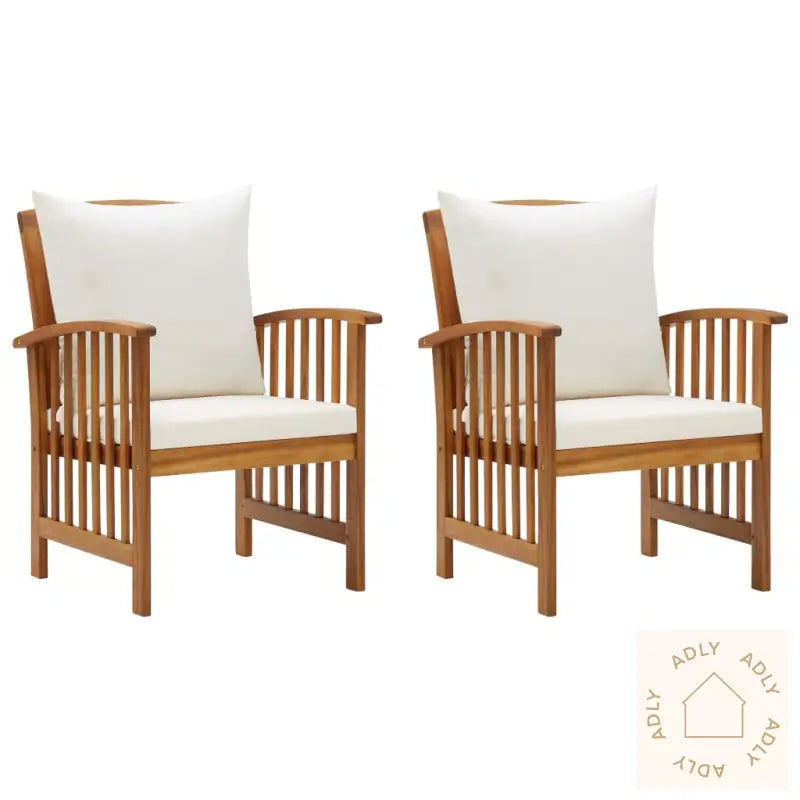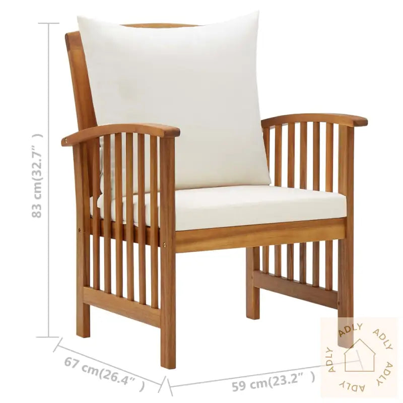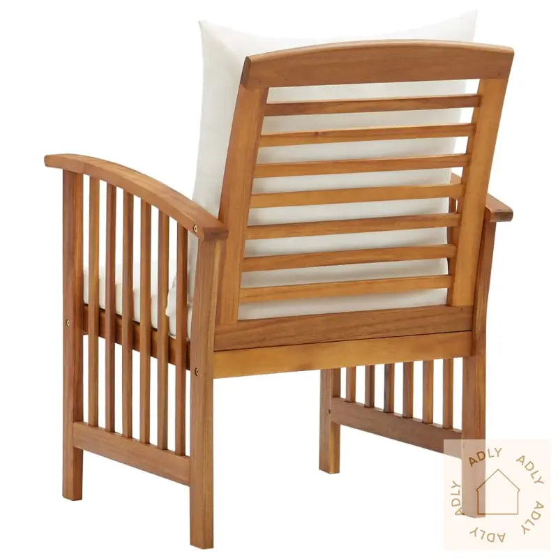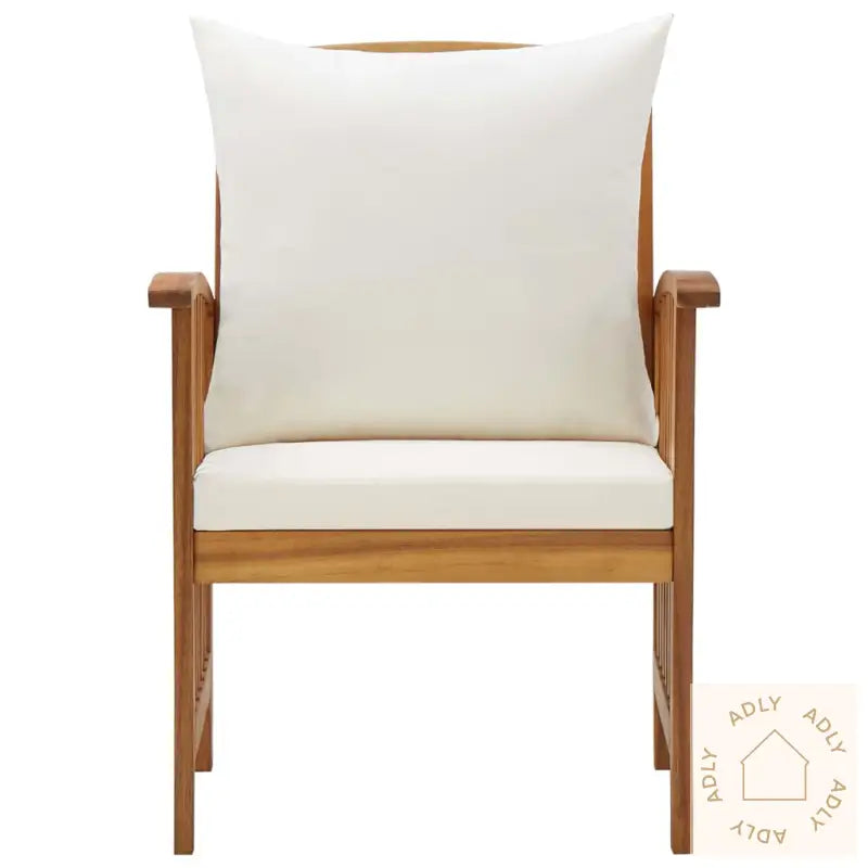 Stolene er laget av heltre akasie som har fått en vakker oljefinish, noe som ikke bare gir et naturlig uttrykk, men også sikrer styrke og lang holdbarhet. Hver stol er unik takket være de naturlige tremønstrene – ingen er helt like, og håndverket gir ekstra karakter til hvert møbel. Komforten er ivaretatt med både sete- og ryggputer i kremhvit polyester, som skaper et behagelig sted å slappe av utendørs, enten det er lange ettermiddager med venner eller stille morgener med kaffe.
