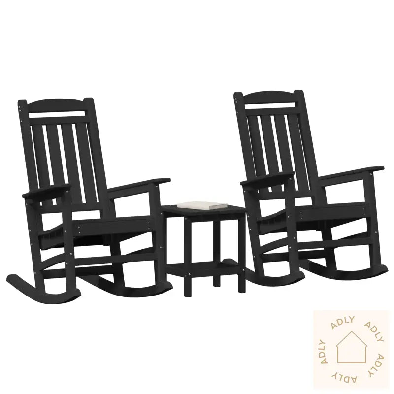 Holdbarhet: Settet er produsert i høy tetthet polyetylen (HDPE), kjent for sin lange levetid og motstand mot både UV-stråler og vann. Du slipper å bekymre deg for falming eller sprekker, så møblene ser flotte ut år etter år.Komfort: Gjennomtenkte detaljer som buet rygg og armlener gir ekstra komfort, så du kan sitte ute lenge uten å bli sliten.Klassisk stil: Den sorte, matte finishen gir en elegant touch som matcher det meste av annen utemøblering.Allsidig bruk: Passer like bra til hagestuen, balkongen eller terrassen – ideelt for grilling, sammenkomster eller rolig avslapning ute.Plassbesparende: Settet tar liten plass, så det passer til både romslige uteområder og små hjørner.Antall gjenstander: 3Farge: SvartForm: RektangulærMateriale: Syntetisk plast (høy tetthet polyetylen)Finish: MattInnendørs/Ute: Kun utendørsTrekk inkludert: NeiBatterier inkludert: NeiMaksimalt antall personer: 3Sittekapasitet per stol: 1Gynger: NeiLevering inneholder: 2 stoler, 1 bordMontering kreves: JaAnbefalt antall personer for montering: 2